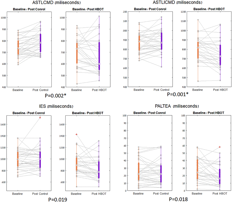 Notably, the patients were given different test versions of the CANTAB test battery at baseline and after the control/HBOT period, to allow repeated administrations with minimal learning effects. The current version of CANTAB has no population norms for either parameter.