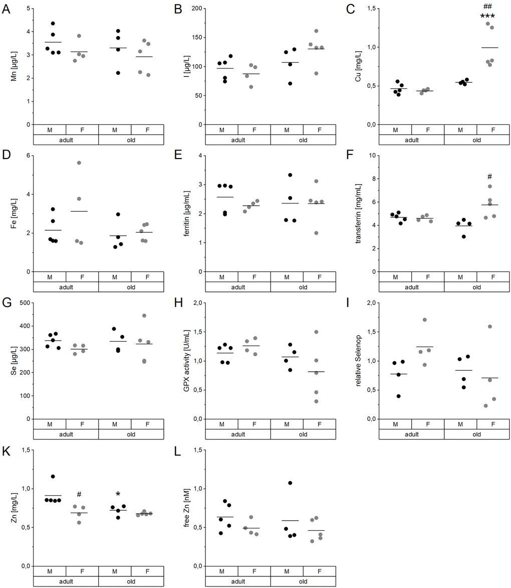 We aim to systematically extend this concept by considering six essential and health-relevant TEs in parallel, namely Cu, iodine (I), iron (Fe), manganese (Mn), Se, and Zn. To this end, age-related TE profiles are determined in serum and several organs of adult versus old C57BL/6Jrj mice and correlated with parameters of aging, e.g., nitrated proteins, epigenetic modifications, inflammatory mediators, and Nrf2 target genes. This will provide the basis for further studies concerning the underlying mechanisms of age-related shifts in TE profiles and the relevance of these changes for age-related characteristics and diseases.