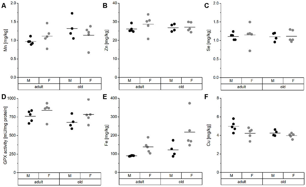 TE concentrations in the liver did not show any significant difference between groups (Figure 2). Mn, Zn, and Se concentrations, as well as hepatic GPX activity, were entirely stable in all groups (Figure 2A–2D). Only Fe and Cu concentrations showed a trend toward upregulation of Fe and downregulation of Cu in old mice (Figure 2E, 2F), which was significant when considering all mice irrespective of sex (Supplementary Table 2). Thus, aging affects Cu levels in opposite directions in serum and liver (Figure 3).