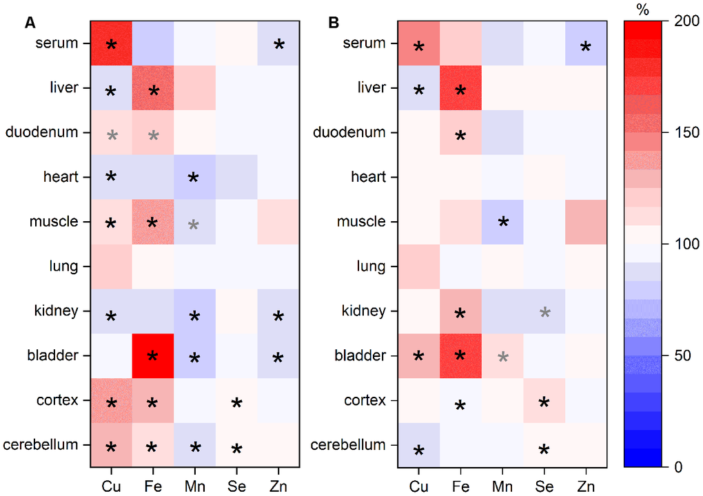 Besides serum and liver, the distribution of Cu, Fe, Mn, Se, and Zn was further assessed in duodenum, heart, muscle, lung, kidney, bladder, cortex, and cerebellum. Across these organs, we observed profoundly different distribution patterns for the analyzed TEs (Figure 3, Supplementary Table 2). Overall, Se and Zn levels in organs were relatively stable across the age groups. If Zn concentrations were altered, they were downregulated in old mice. In most organs of old mice, Mn was also consistently downregulated. In contrast, Fe was upregulated showing the highest fold change in bladder. Cu was decreased in liver, heart, and kidney of old mice but increased in all other organs, with exception of the bladder (Figure 3A). Sex-related differences were observed for Fe with higher levels in females (Figure 3B).