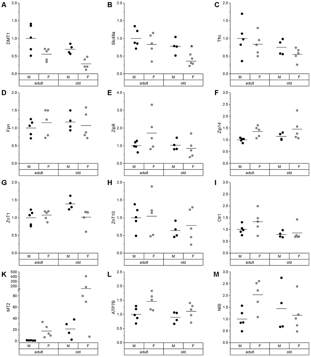 In the liver, which was the organ with the highest TE concentrations in this study (Supplementary Table 2; [61]), we observed a trend toward higher Fe levels in old than in adult mice (Figure 2E) together with reduced hepatic Cu levels (Figure 2F). This has been previously described for individual TEs during aging [23, 62–64], but has not been shown to be linked to each other. Strikingly, this relationship was unique for the liver. In most other organs, significant positive correlations between Fe and Cu were observed (Supplementary Figure 1). To understand the underlying mechanisms of age-dependent changes in hepatic TE concentrations, expression levels of transport and binding proteins were analyzed. DMT1, a transporter shared by Cu and Fe [65], was downregulated in old mice (Figure 4A), which provides an explanation for lower hepatic Cu levels in old mice. Besides DMT1, Cu ions are mainly transported by Ctr1, which was downregulated with age as well (Figure 4I). ATP7B expression also tended to be downregulated in old mice (Figure 4L), thus enhanced Cu export from liver does most probably not contribute to lower hepatic Cu levels. Other studies have, however, not detected any age-related change in net Cu absorption [66]. Serum Fe is mainly bound to transferrin and taken up by a Tfrc-mediated mechanism, but Tfrc expression was unaffected by age (Figure 4C). The same was the case for the Fe exporter Fpn (Figure 4D). Based on these observations, age-related restrictions of hepatic Cu levels were associated with lower expression levels of transporters, while the increase in hepatic Fe concentrations appears to depend on other mechanisms.