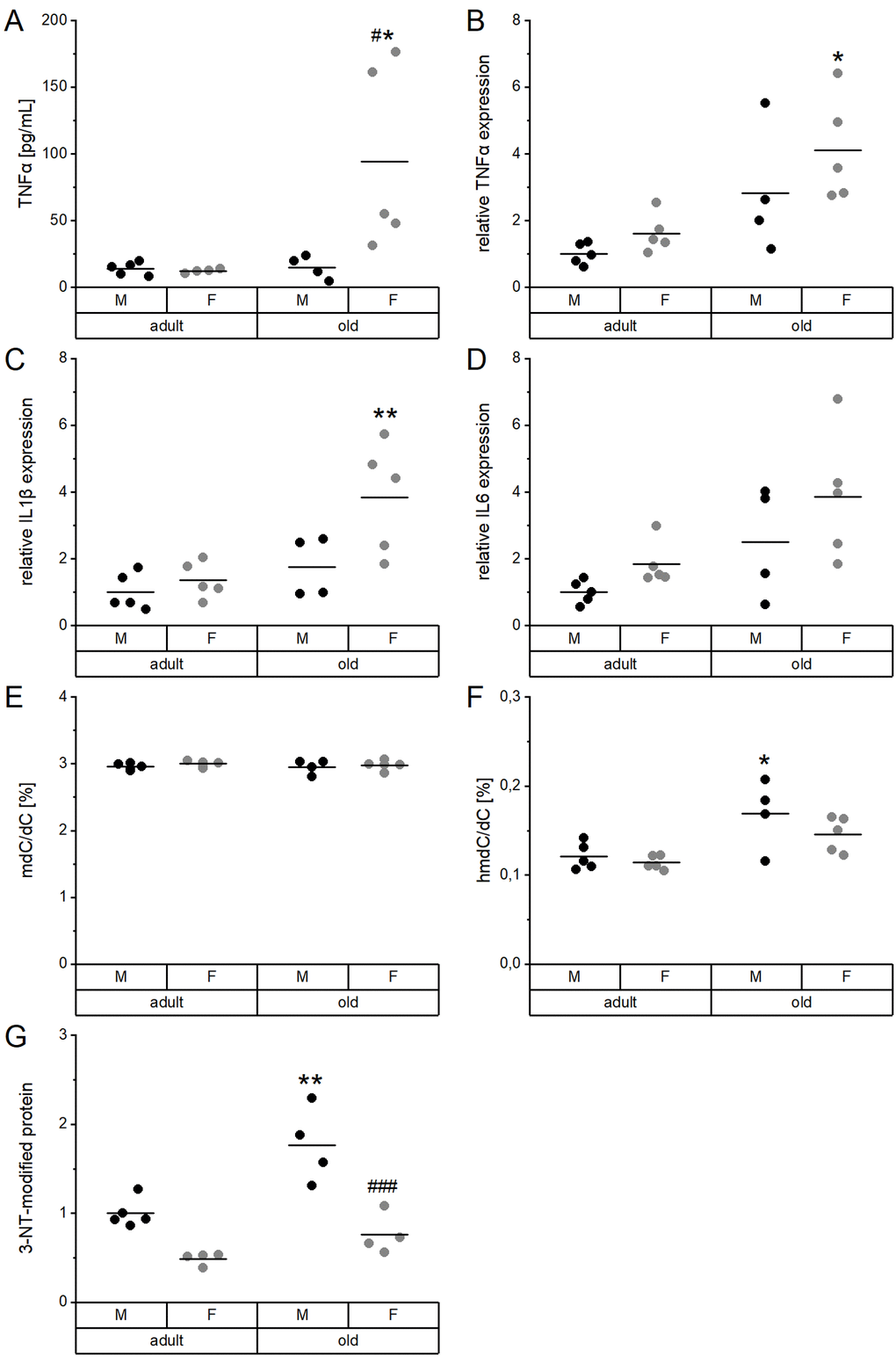 Global DNA methylation (mdC/dC) in the liver was neither affected by age nor sex (Figure 5E), whereas DNA hydroxymethylation (hmdC/dC) was significantly enhanced in old male mice (Figure 5F). Hepatic levels of tyrosine nitrated proteins (3-NT) were also increased in old male mice compared to adult males. Levels were generally lower in females than in males (Figure 5G). DNA hydroxymethylation correlated with 3-NT-modified proteins but not with the hepatic concentration of any of the TEs (Supplementary Table 4, Supplementary Figure 1).