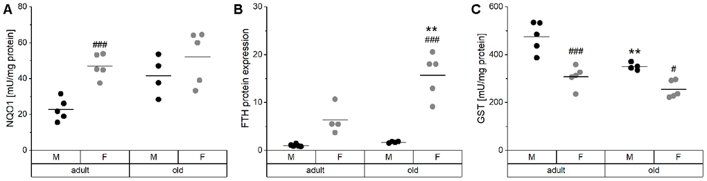 Hepatic Nrf2 target genes were analyzed, including NQO1 activity, FTH expression, and total GST activity (Figure 6). Especially in male mice, NQO1 activity tended to increase with age and showed higher overall values in females (Figure 6A). The same age-dependent increase was observed in heart, lung, and kidney of male mice (Supplementary Figure 4). FTH levels revealed a similar pattern as NQO1 activity with higher levels in females and an age-dependent increase (Figure 6B). Both hepatic NQO1 activity and FTH expression correlated positively with the expression of inflammatory mediators and with Fe concentrations in the liver (Supplementary Table 4, Supplementary Figure 1). Interestingly, hepatic GST activity behaved in an opposite manner being decreased with age (Figure 6C) and increased in male mice. However, these effects on GST were not detected in other organs (Supplementary Figure 4).