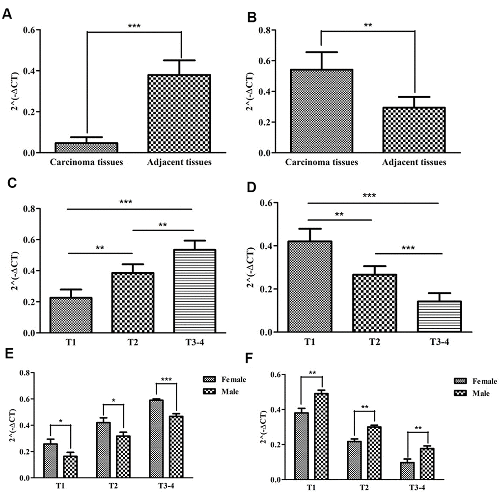 We previously explored the roles of SNHG16 and ADAMTS9-AS1 on predicting prognosis by bioinformatics methods (Supplementary Figure 1). To further verify the relationships between sIRlncRs and the clinicopathologic features, as well as discover the roles of sIRlncRs on indicating clinical prognosis, we detected the expression levels of SNHG16 and ADAMTS9-AS1 in carcinoma and adjacent tissues of pRCC patients with different genders and T-stages. Given age was insignificant associated with the five sIRlncRs, it was removed in the verification process. As illustrated in Figure 10, compared with adjacent tissues, the higher expression of SNHG16 (Figure 10A) was detected in carcinoma tissues, but ADAMTS9-AS1 (Figure 10B) showed the reversed expression level. Besides, the expression of SNHG16 (Figure 10C) and ADAMTS9-AS1 (Figure 10D) were significantly more and lower respectively in T3 and 4 stages compared with that in earlier T-stages. Female patients were detected to obtain the higher expression levels of SNHG16 (Figure 10E) and the lower expression levels of ADAMTS9-AS1 (Figure 10F) than male.