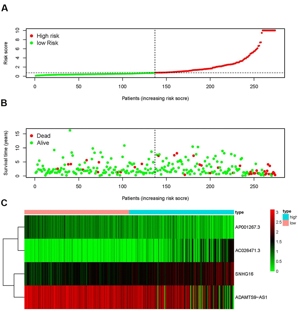 The top 4 sIRlncRs (AP001267.3, AC026471.3, SNHG16 and ADAMTS9-AS1) among the 5 sIRlncRs were included to establish the risk evaluating model, by which the pRCC samples were divided into the high-risk group and the low-risk group based on the intermediate risk score (Figure 2A). The mortality rate constantly increased with the higher risk score (Figure 2B). And with the increase of risk score, the expression levels of AC026471.3 and SNHG16 were elevated, while AP001267.3 and ADAMTS9-AS1 expressed decreasingly (Figure 2C). The survival of the high-risk group was significantly shorter than that of the low-risk group (Figure 3).