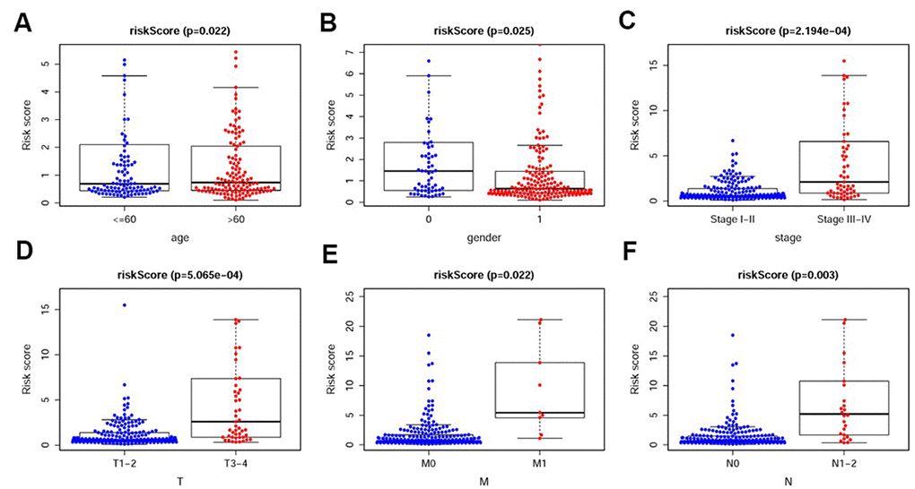 To investigate the relevance of the sIRlncRs and clinicopathological features of pRCC, we analyzed the correlation between the risk score and the clinical and demographic characteristics, such as age, gender, stage, T-stage, N-stage and M-stage. Under the IRRS, the scores of older patients (Figure 4A), female patients (Figure 4B), patients with advanced stage (Figure 4C), advanced T-stage (Figure 4D), advanced M-stage (Figure 4E) and advanced N-stage (Figure 4F) were significantly increased. The above results elucidate some clinical and demographic characteristics that are sensitive to the IRRS and further corroborate the clinicopathological application value of the model.