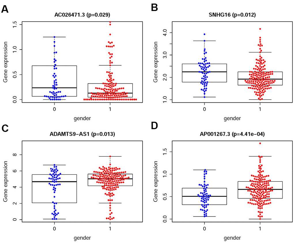 We also analyzed the relationships between the compositions of the IRRS and the aforementioned tumor characteristics which all illustrated in Table 1. The expression levels of SNHG16 and AC026471.3 were higher in female patients (Figure 5A–5B). However, the expression levels of AP001267.3 and ADAMTS9-AS1 were lower in female patients (Figure 5C–5D).