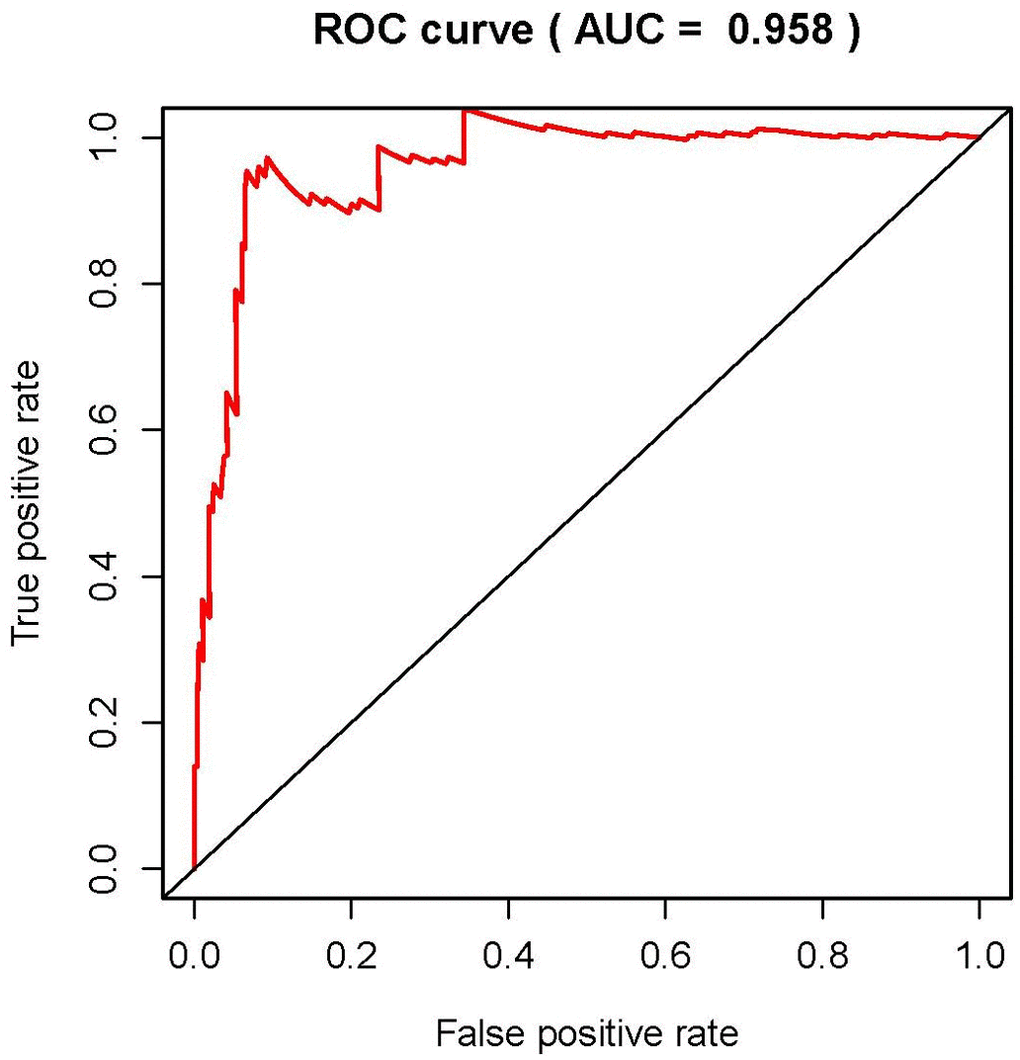 We then conducted the independent risk analysis, the results showed age, stage, N-stage, M-stage and risk score were significantly correlated with OS in univariate analysis (P<0.05). But in the multivariate analysis, M-stage and risk score showed more remarkable correlations with OS (Table 2). The ROC curve represented the accuracy of the model. The AUC of risk score was 0.958 (Figure 7). These results suggested the risk score was an independent prognostic factor.