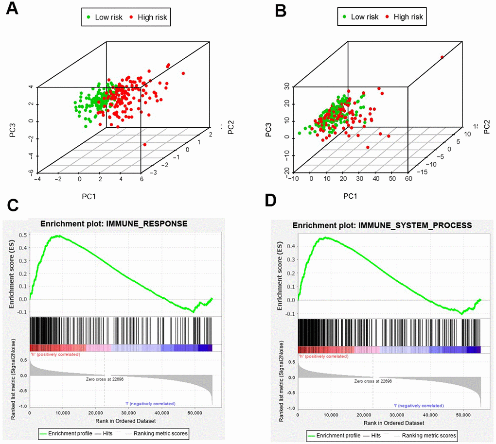 We employed the PCA to detect the different distribution patterns between the low-risk group and the high-risk group by the immune gene sets and the genome-wide expression sets. In the IRGs set, the low-risk group and the high-risk group were observably separated with the lower immune scores in the low-risk group (Figure 8A). While we didn’t detect the significant the separation of the immune scores on the basis of the genome-wide expression profiles (Figure 8B). The results of GSEA further proved the functional annotation, with the more active immune-related responses and processes in the high-risk group (Figure 8C and 8D).