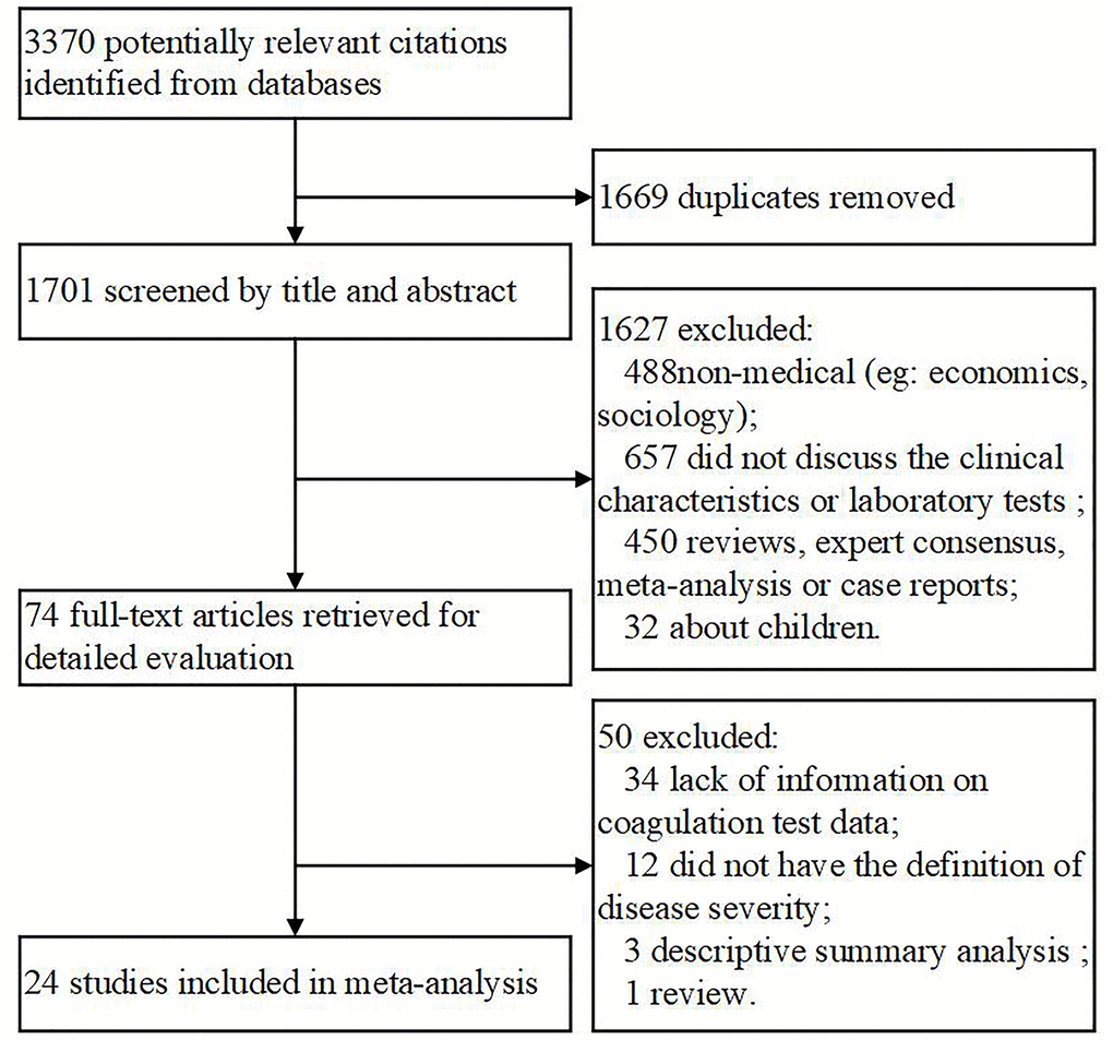 Overall, 3370 documents were initially identified based on our search criteria and a reference list (Figure 1). Subsequently, 1669 files were excluded because of duplication, and 1627 were excluded after reading the title and abstract and finding that the materials were not related to medicine (n = 488) or failed to report clinical characteristics or laboratory tests (n = 657) or that they were reviews (n = 271), or expert consensus (n = 96), meta-analyses (n = 9), or case reports (n = 74). Additionally, 32 documents relating to children were excluded. As a result, 74 articles were selected for full-text assessment. Of the 74 studies, 50 were disqualified for lacking information on coagulation test data (n = 34), or having no definition of disease severity (n = 12), or lacking descriptive summary analyses (n = 3), or being a review (n = 1). In the end, 24 articles were included for the meta-analysis. To eliminate bias, the detailed endpoint was split into severity and composite endpoint instead of a rough poor outcome. Also, we analyzed several biomarkers individually rather than treat them as one entity.