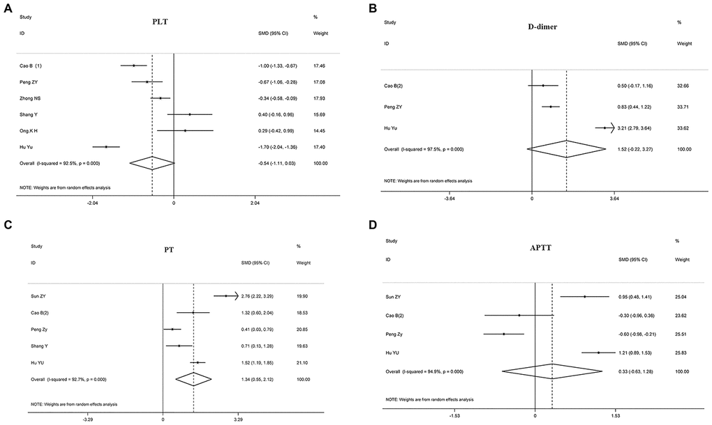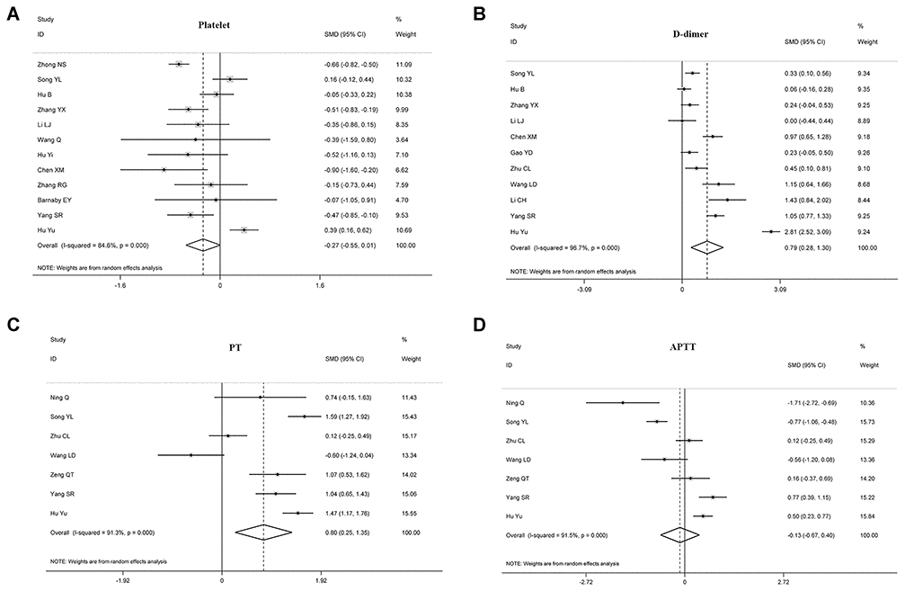 The criteria for including a study in the meta-analysis were as follows: (I) the COVID-19 patient cohort was confirmed primarily by laboratory detection; (II) the endpoint was severity status and/or composite endpoint (including ICU monitoring and death); (III) groups were established for comparison; (IV) the correlation of coagulation biomarkers with endpoints was recorded. Exclusion criteria were as follows: (I) review articles, case reports, and laboratory studies; (II) studies with insufficient data for estimating pooled standard mean differences (SMD).