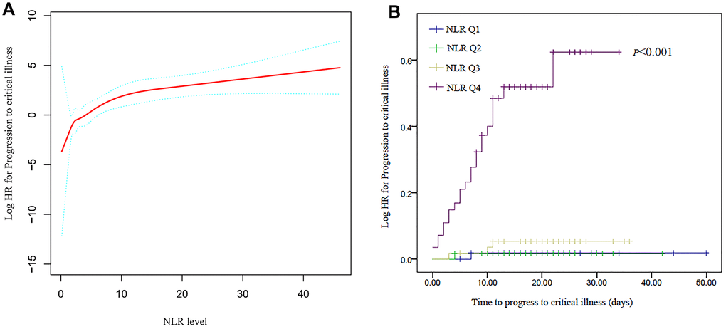 Figure 1A shows the association between the NLR and progression to critical illness, as identified using a Cox proportional hazards model adjusted for the baseline covariates. For the sensitivity analysis, we converted the NLR from a continuous variable to a categorical variable (the quartile of NLR), and the P for trend of the NLR with categorical variables in the fully adjusted model (model II) was consistent with that obtained when the NLR was a continuous variable. The relationship between the NLR and progression was significant and graded (HR: 1.16 per unit; 95% CI: 1.10-1.22; P<0.001). When adjusted for sex and age, the ratio of the highest quartile of the NLR compared to the lowest quartile was 33.017 (95% CI 4.436-245.732, P <0.001), and in the fully adjusted model, the odds of the NLR as a clinical risk factor was 21.755 (95% CI 2.854-165.860, P<0.001) (Table 5). Figure 1B shows the Kaplan-Meier analyses graphs for progression to critical illness based on the quartiles of the NLR.