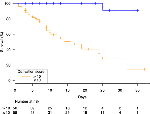 Comparisons of baseline characteristics between survivors and non-survivors were performed using the log-rank test. A Cox uni- and multivariate proportional-hazard regression model was run to assess factors associated with one-month mortality. Model assumptions were verified. Variables yielding P values ≤ 0.25 in the univariate analysis were considered for inclusion in the multivariate analysis using a backward procedure according to the lowest Akaïke Information Criteria. Continuous variables were expressed per one IQR of more. We then assessed interaction terms between predictors. A derivation score for each predictor was created using Hazard Ratio point-based scoring system [23]. We categorized this score by the median. The calibration of the derivation score was assessed by using the Grönnesby and Borgan test. A P value ≥ 0.05 was considered to indicate good calibration. Discrimination by the derivation score was assessed using Harrell’s C index with 95%CI. Survival curves were plotted according to the Kaplan-Meier method with the derivation score divided by median. Internal validation was performed with the bootstrap-adjusted Harrell’s C index with 1000 resamples as recommended by the TRIPOD guidelines [24].