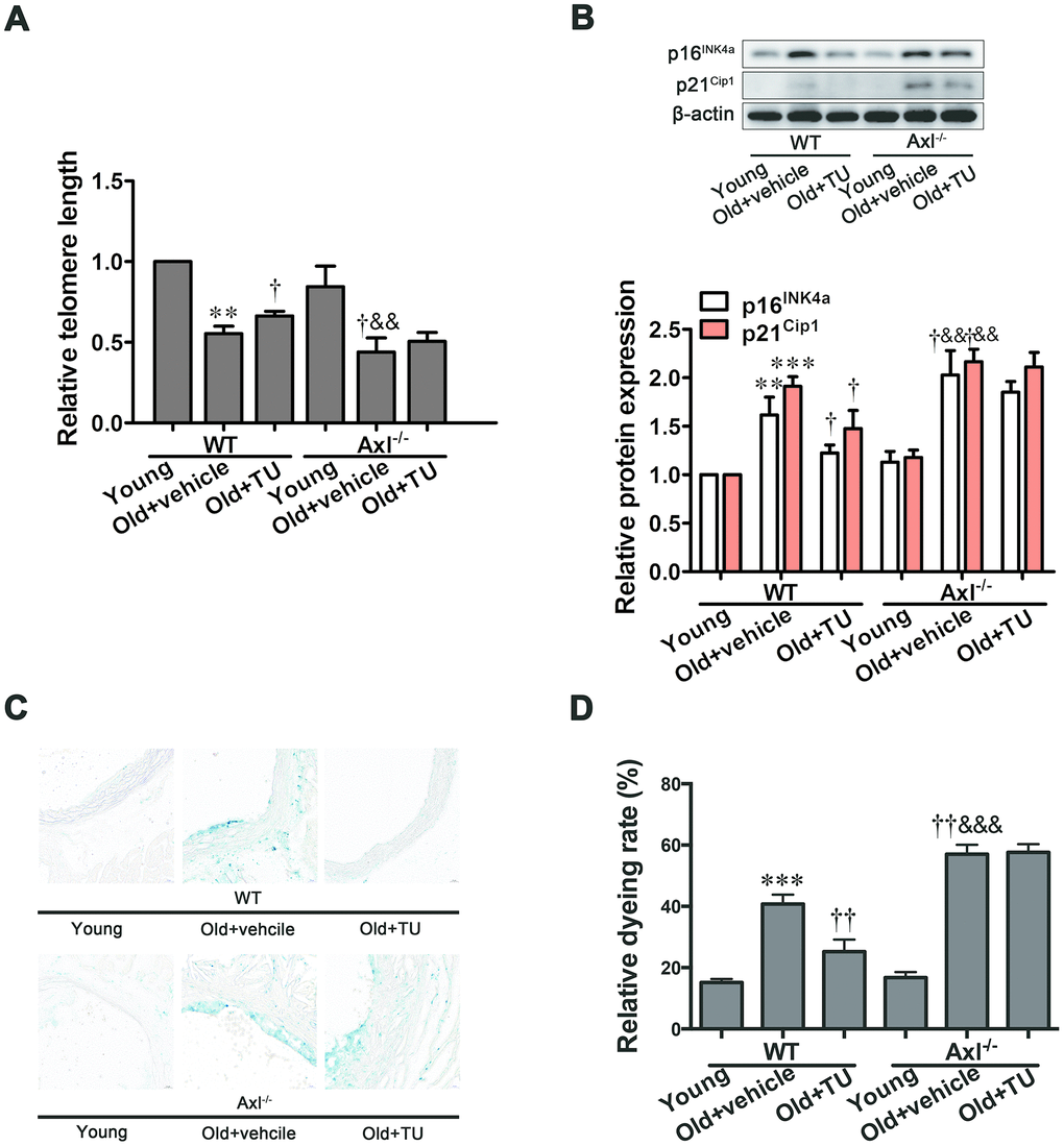 Telomere length was significantly shortened in WT (P<0.01) and Axl-/- (P<0.01) old groups compared to WT and Axl-/- young groups (Figure 2A), and telomere length in Axl-/- old group was shorter than WT old group (P<0.05) (Figure 2A). With TU treatment, the telomere length in WT old+TU group was significantly longer than WT old group (P<0.05) (Figure 2A). Telomere length in Axl-/- old+TU group was not longer than Axl-/- old group (Figure 2A). The protein expression of p16INK4a and p21Cip1 were increased in WT and Axl-/- old groups compared with WT and Axl-/- young groups (P<0.01~P<0.001) (Figure 2B). The Axl-/- old group had the highest p16INK4a (P<0.05) and p21Cip1 (P<0.05) expression compared with all other groups (Figure 2B). With TU treatment, the expression of p16INK4a (P<0.05) and p21Cip1 (P<0.05) in WT old+TU group was significantly decreased compared with WT old group (Figure 2B). But the expression of p16INK4a and p21Cip1 in Axl-/- old+TU group were not significantly decreased compared with Axl-/- old group (Figure 2B). The changing trend of SA-β-Gal staining rate was the same as that of p16INK4a and p21Cip1 (Figure 2C, 2D).