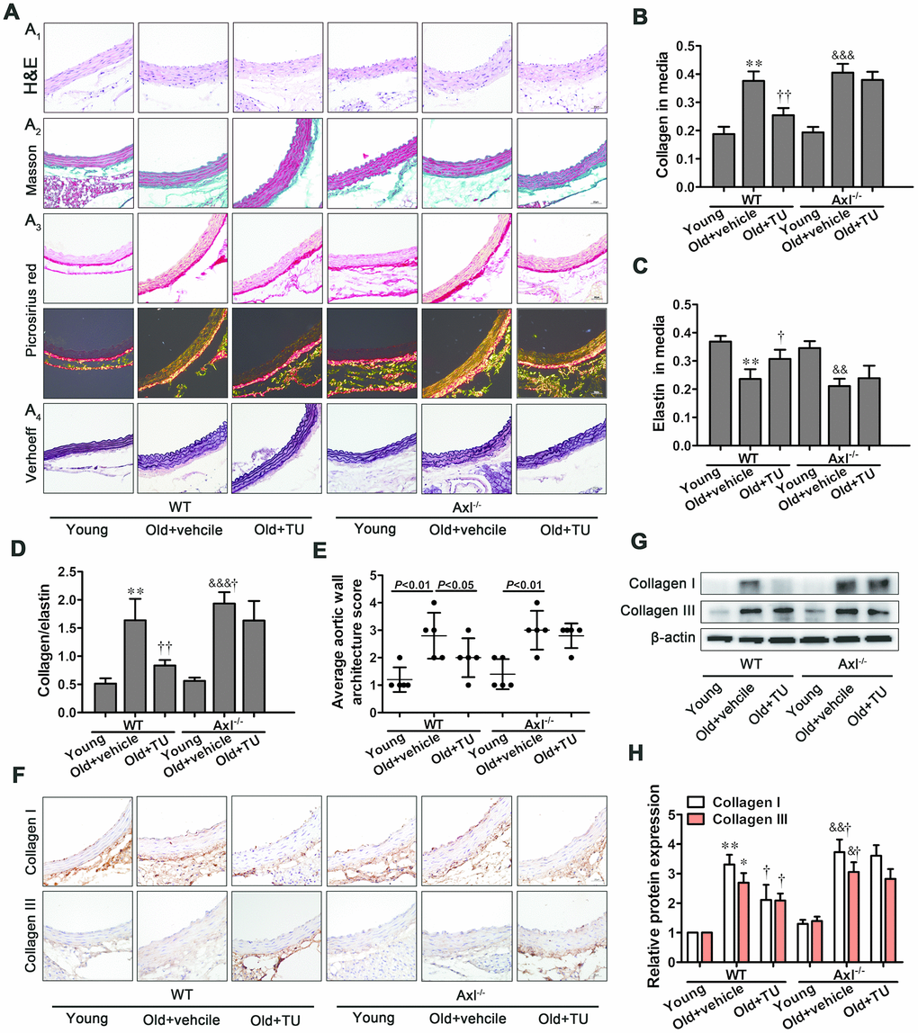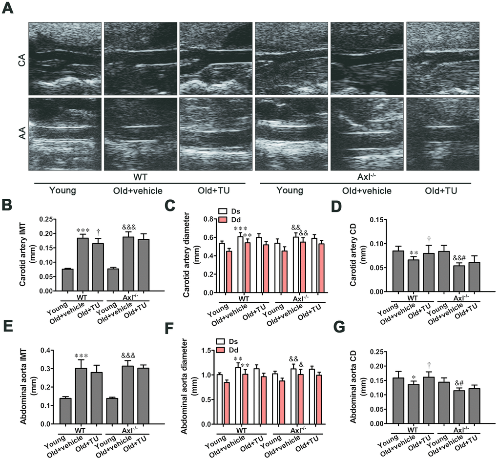 Both diastolic diameter (Ds) and systolic diameter (Dd) of the carotid artery and abdominal aorta in WT and Axl-/- old groups were significantly increased compared with WT and Axl-/- young groups (P<0.05~P<0.001) (Figure 3A, 3C, 3F). However, there was no significant difference of Ds and Dd between Axl-/- old group and WT old group with or without TU treatment (Figure 3A, 3C, 3F). The coefficient distention (CD) of carotid artery and abdominal aorta in WT and Axl-/- old groups were smaller than the WT and Axl-/- young groups (P<0.05~P<0.01) (Figure 3A, 3D, 3G). The CD of carotid artery (P<0.05) and abdominal aorta (P<0.05) in Axl-/- old group were smaller than the WT old group (Figure 3A, 3D, 3G). With TU treatment, the CD of carotid artery (P<0.05) and abdominal aorta (P<0.05) in WT old+TU group were decreased compared with WT old group (Figure 3A, 3D, 3G). There was no significant difference between Axl-/- old+TU group and Axl-/- old group (Figure 3A, 3D, 3G).