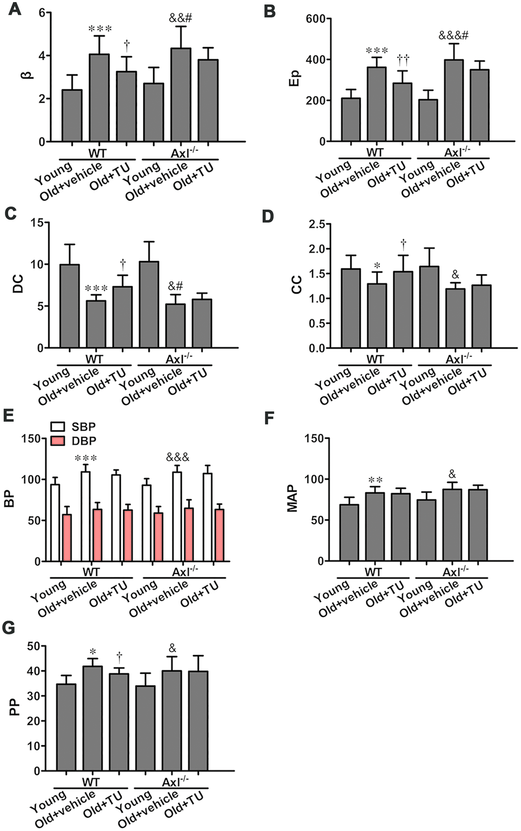 Both systolic pressure (SBP) and diastolic blood pressure (DBP) were increased in WT and Axl-/- old groups compared with WT and Axl-/- young groups (P<0.05~P<0.001) (Figure 4E). The SBP and DBP of Axl-/- old group were slightly higher than WT old group (Figure 4E). With TU treatment, the SBP and DBP of WT old+TU group were slightly decreased compared with WT old group (Figure 4E). However, no significant difference was found between Axl-/- old+TU group and Axl-/- old group in SBP and DBP (Figure 4E). The mean blood pressure (MBP) of WT (P<0.01) and Axl-/- (P<0.05) old groups were increased significantly compared with WT and Axl-/- young groups (Figure 4F). However, there was no significant difference in MBP between WT old+TU group and WT old group, Axl-/- old group and WT old group, Axl-/- old+TU group and Axl-/- old group (Figure 4F).