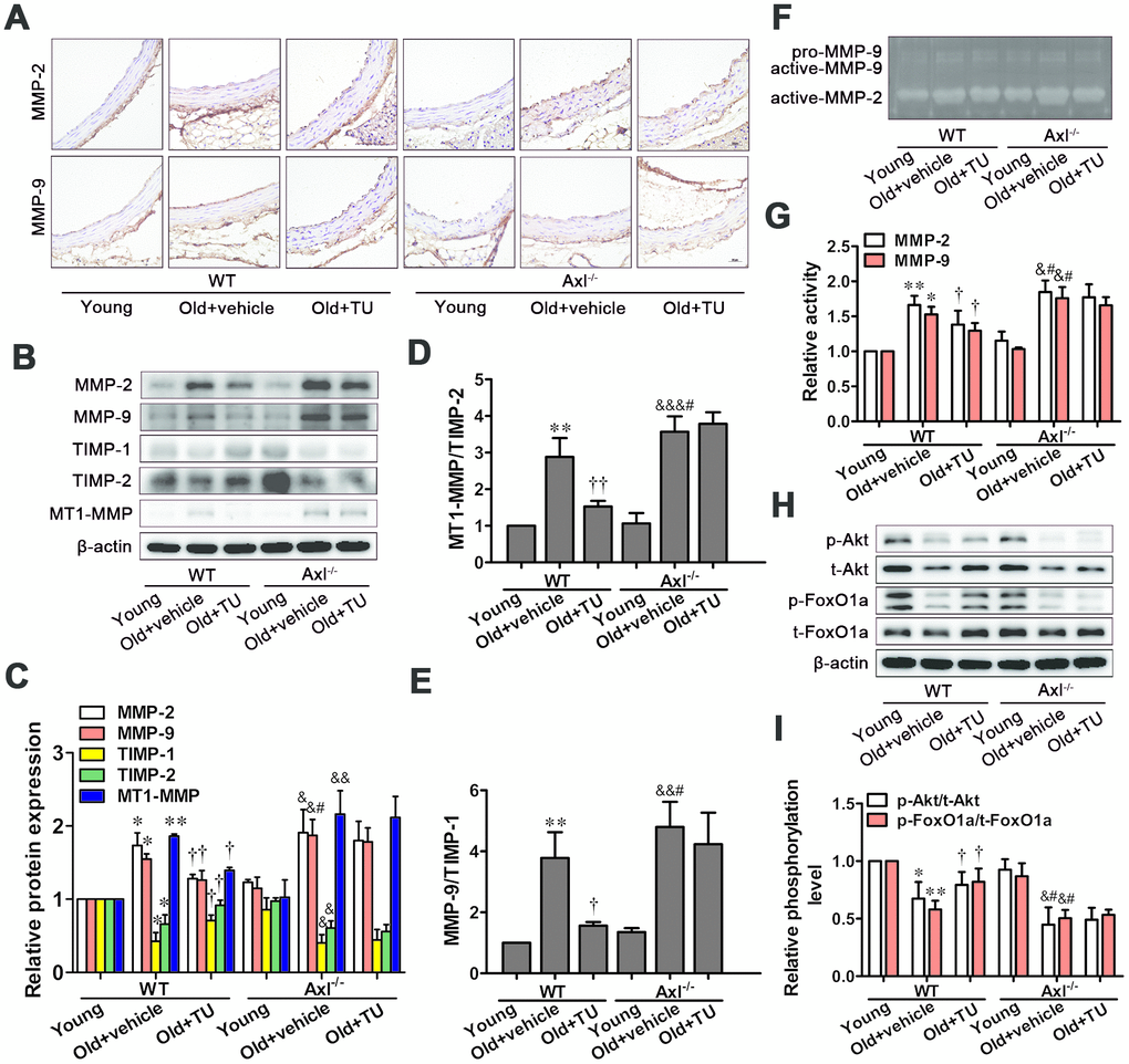 Immunohistochemical staining, Western blot and Zymography results showed that MMP-2 and MMP-9 expression and activity were significantly increased in WT and Axl-/- old groups compared with WT and Axl-/- young groups (P<0.05, P<0.01) (Figure 6A–6C, 6F, 6G). The MMP-2 and MMP-9 expression and activity in Axl-/- old group were higher than WT old group (P<0.05) (Figure 6A–6C, 6F, 6G), and were significantly decreased in WT old+TU group compared with WT old group (P<0.05) (Figure 6A–6C, 6F, 6G). But there was no significant difference between the Axl-/- old group and Axl-/- old+TU group (Figure 6A–6C, 6F, 6G).