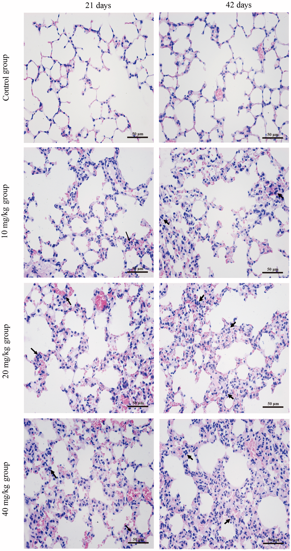 At 21 and 42 days, eight mice (male female half) in each group were humanely killed and their lungs were removed, fixed in 4% paraformaldehyde solution, dehydrated with increasing concentrations of ethanol, cleared with xylene and embedded in paraffin. And then lungs were serial sectioned at 5μm thickness, stained with hematoxylin and eosin (H&E), and observed by optical microscopy.