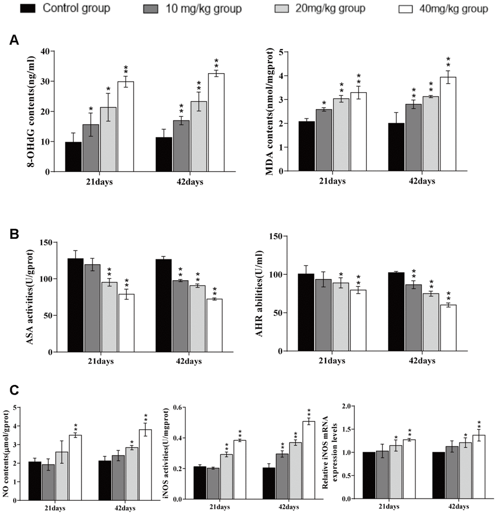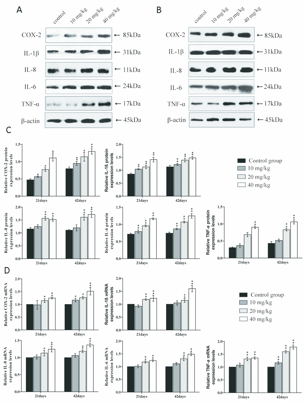 The mRNA expression levels and protein expression levels of cyclooxygenase-2 (COX-2), interleukin-1β (IL-1β), interleukin-8 (IL-8), and interleukin-6 (IL-6) were significantly increased (p < 0.01 or p < 0.05) in the 20 and 40 mg/kg groups in comparison to the control group at 21 and 42 days of the experiment.