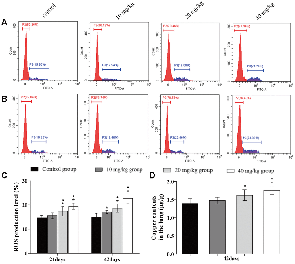 The ROS production levels were increased (p < 0.05 or p < 0.01) in the 20 and 40 mg/kg groups at day 21 of the experiment and in the three CuSO4-treated groups at day 42 of the experiment when compared to the control group. The Cu contents in the lung were increased (p < 0.05 or p < 0.01) in the 20 and 40 mg/kg group at day 42 of the experiment when compared to the control group. The results are illustrated in Figure 2.