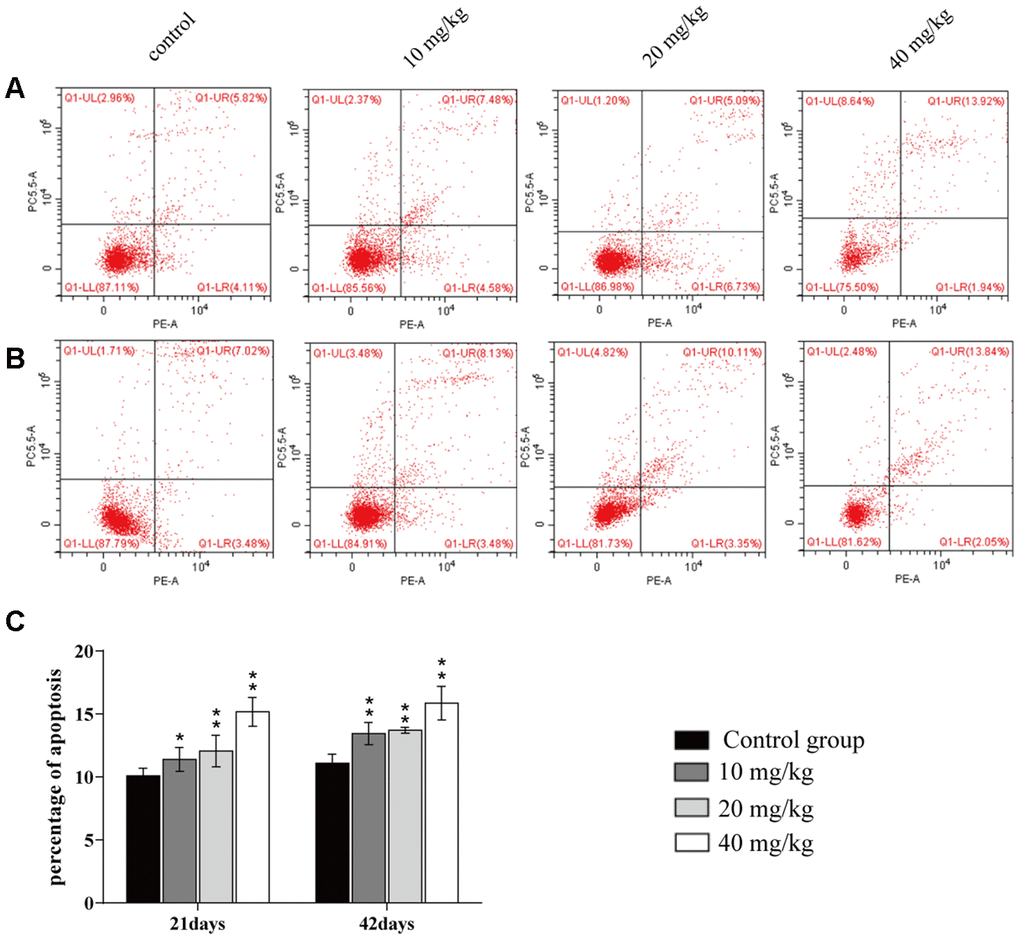 The apoptotic percentages were elevated (p < 0.05 or p < 0.01) in the three CuSO4-treated groups at days 21 and 42 of the experiment when compared to the control group, as shown in Figure 5.