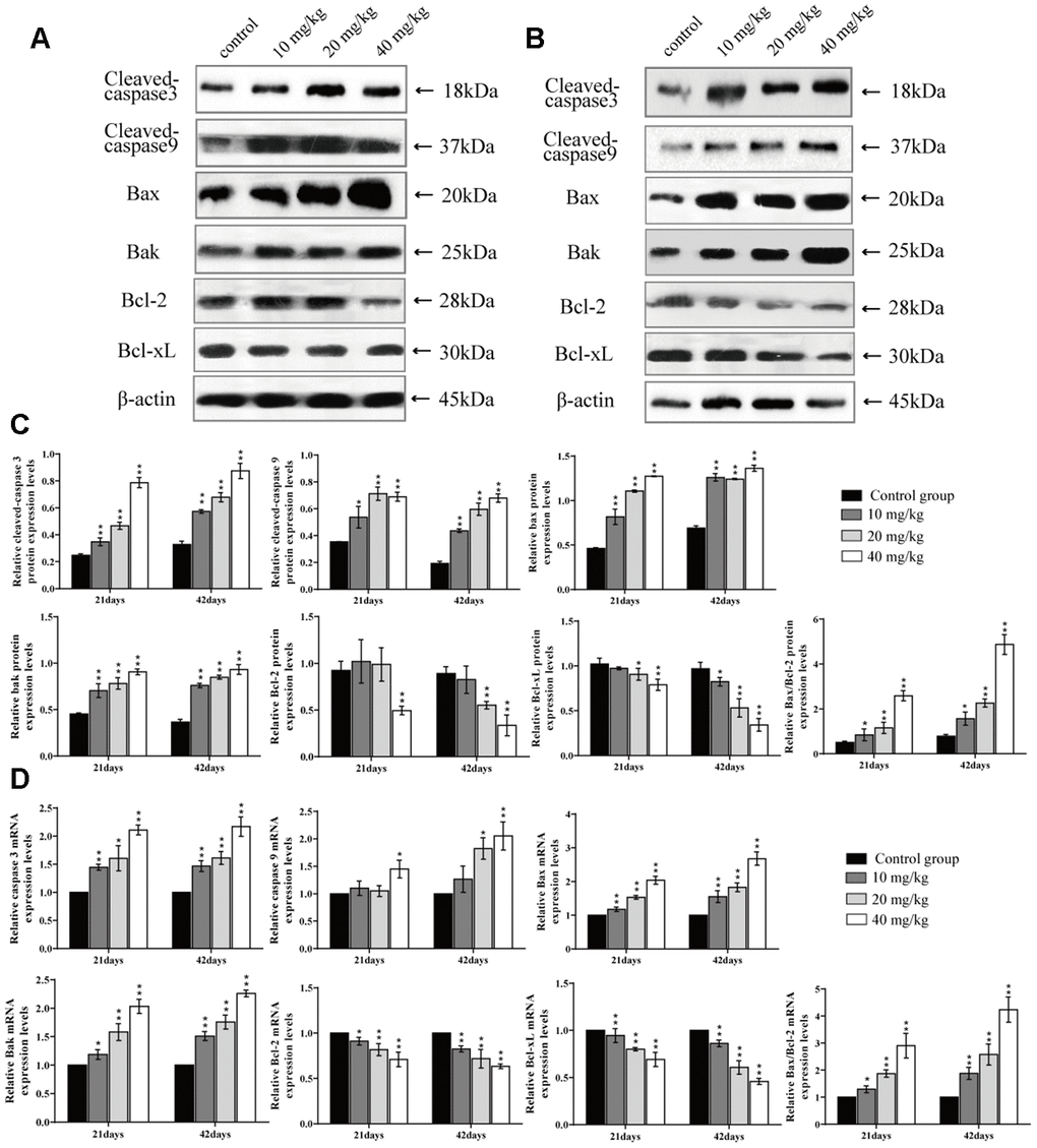 It has been known that ROS and oxidative stress play important roles in the early stages of apoptosis [68]. Next, we explored whether, or not, apoptosis was also involved in the mechanism of CuSO4-cuased toxicology in the lung. After CuSO4 treatment, the results indicated that the percentage of apoptosis was increased in the CuSO4-treated groups at 21 and 42 days. Apoptosis is a process controlled by multiple genes, such as bcl-2 family and caspase family, which are conserved among species [69]. As a group of important apoptotic regulators, the bcl-2 family can indirectly regulate caspases in relevant apoptotic pathways [70, 71]. Results in the present study showed that CuSO4 could cause a significant decrease in the protein expression levels and mRNA expression levels of anti-apoptotic proteins (Bcl-2 and Bcl-xL), while the protein and mRNA expression levels of pro-apoptotic proteins (Bax and Bak) were significantly increased in the lung. Hsien et al. (2008) has also observed that Cu-induced apoptosis was accompanied by the increased Bax and Bak expression levels and a decreased Bcl-2 expression level in neuroblastoma cells [72]. We also observed an increased Bax/Bcl-2 ratio in this research. Lee et al. (2008) has indicated that the increase of the ratio between Bax and Bcl-2 is the key point in the occurrence of apoptosis [73]. This increased Bax/Bcl-2 ratio leads to changes in mitochondrial membrane permeability and the release of apoptotic proteins, such as Cyt c [74]. In addition, excessive ROS production with decreasing concomitant in GSH contents also leads to mitochondrial membrane permeability and induction of apoptotic cell death in cultured cells [75]. Cyt c can cleave and activate caspase-9, which then activates downstream caspase-3 and cell apoptosis [76]. In this study, CuSO4 increased mRNA expression levels of caspase-9 and -3 and protein expression levels of cleaved-caspase-9 and -3, which contributed to apoptotic occurrence. The reports have also found that apoptosis is caused by copper-induced ROS formation in MCF7 cells [77], rat liver [78], and chicken intestine [79]. In summary, the present study was the first in which CuSO4-induced apoptosis was observed in the lung, and this was accompanied by decreasing Bcl-2, Bcl-xL mRNA expression levels and protein expression levels, and increasing Bax, Bak, caspase-3, and caspase-9 mRNA expression levels and protein expression levels, and the Bax/Bcl-2 ratio.