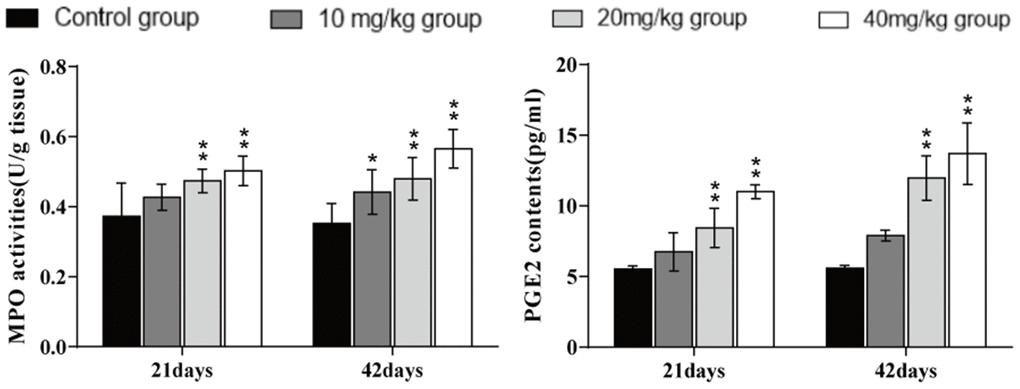 The myeloperoxidase (MPO) activities and prostaglandin E2 (PGE2) contents were significantly higher (p < 0.01) in the 20 and 40 mg/kg groups at days 21 and 42 of the experiment than in the control group, as shown in Figure 7.
