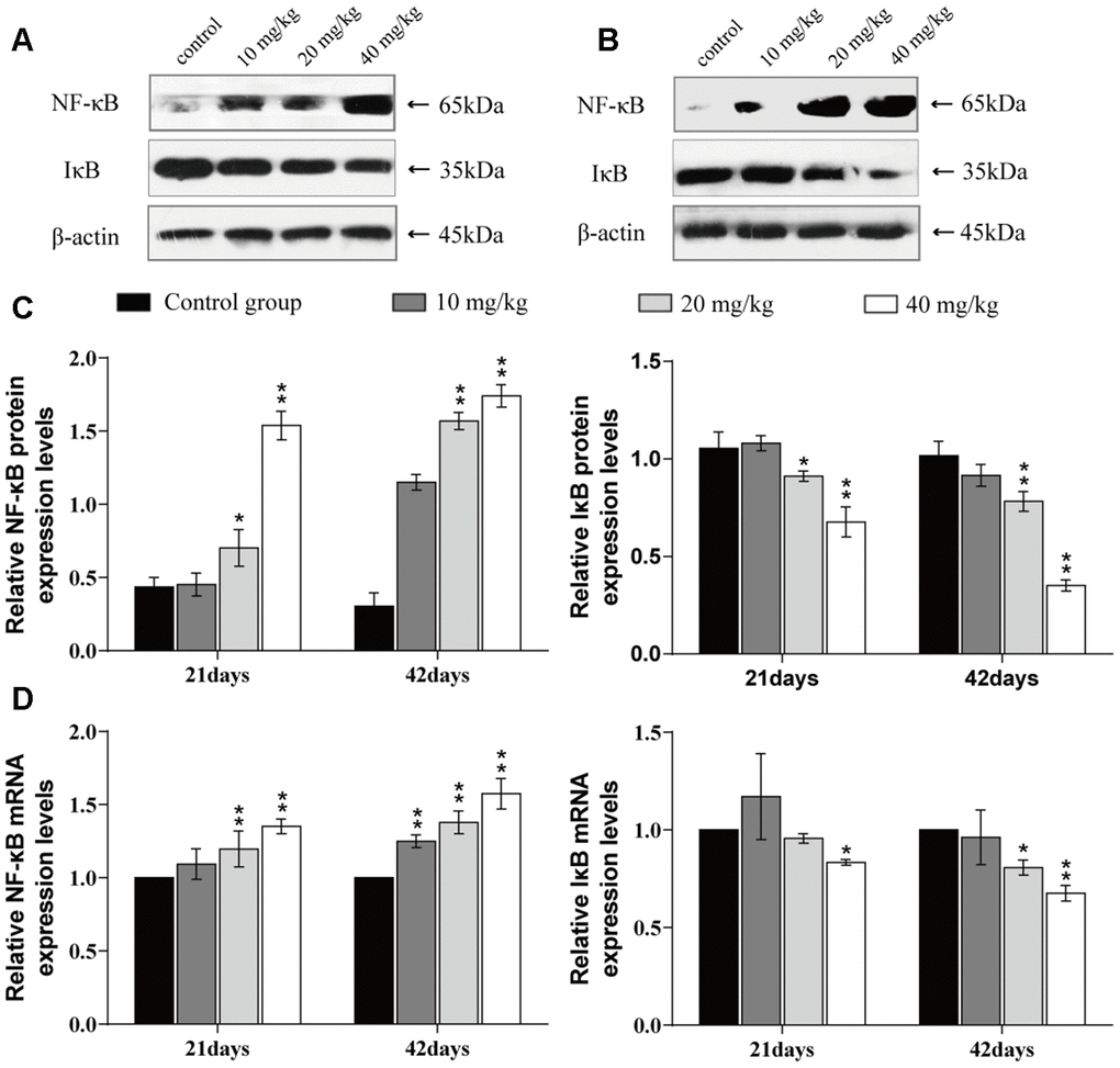 The mRNA and protein expression levels of nuclear factor-kappa B (NF-κB) were significantly higher (p < 0.01 or p < 0.05) in the 20 and 40 mg/kg groups at 21 and 42 days of the experiment than in the control group. The mRNA and protein expression levels of inhibitory kappa B (IκB) were significantly decreased (p < 0.01 or p < 0.05) in the 20 and 40 mg/kg groups at 21 and 42 days when compared to the control group. The results are shown in Figure 8.