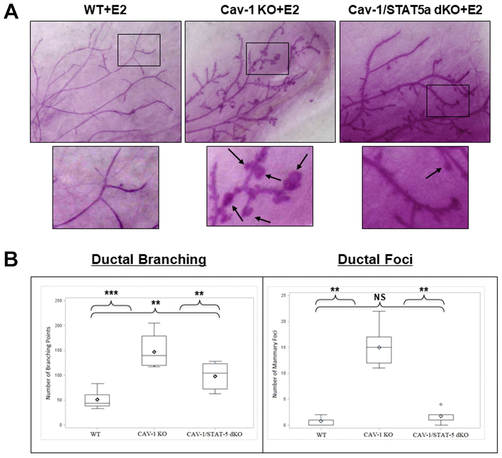 Since DCIS-like lesions secondary to estrogen treatment in Cav-1 KO mice showed increased levels of phosphorylated STAT5a (Y694) as shown in Figure 1, we questioned whether this was a bystander or functional effect of this transcription factor. To study this hypothesis, we compared branching and lesion formation in ovariectomized female WT, Cav-1 KO, and Cav-1/STAT5a double knockout (dKO) mice treated with an estrogen regimen for 60 days by performing whole mounts analysis. As shown in Figure 2A and 2B, estrogen-treated Cav-1 KO mice showed a significant increase in ductal branching (summation of primary, secondary, and tertiary branch points) compared to WT counterparts (2.9-fold, p<0.001, n=7-9). A homozygous deletion of STAT5a in Cav-1 KO mice was sufficient to significantly reduce the development of mammary branching compared to Cav-1 KO mice (1.5-fold, p<0.01, n=7-8), but still significantly higher than the WT group (1.9-fold, p<0.01, n=8-9) (Figure 2B: left panel). While mice lacking Cav-1 expression exhibited a significant increase in mammary foci formation following estrogen stimulation compared to WT mice (19.3-fold, p<0.01, n=7-9) (Figure 2B: right panel), this increase was significantly reduced in Cav-1/STAT5a dKO mice (8.6-fold, p<0.01, n=7-8, compared to Cav-1 KO mice) (Figure 2B: right panel) which reached the levels observed in WT mice (NS, p=0.164, n=8-9, WT vs Cav-1/STAT5a dKO).