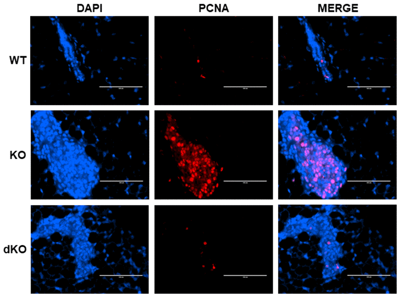 The data above warranted further exploration into the role of STAT5a in estrogen-induced DCIS lesion formation grown within a Cav-1 negative mammary gland. PCNA, a cofactor of DNA polymerase that functions in the G1 and S phases of the cell cycle [29], was investigated through immunofluorescence in estrogen-stimulated WT, Cav-1 KO, and Cav-1/STAT5a dKO mammary glands (Figure 3). The increased level of PCNA nuclear expression observed in Cav-1 KO compared to WT mammary glands (middle panel) was reduced by a homozygous deletion of STAT5a in Cav-1 KO mice. These observations suggest an implication of STAT5a in the cell cycle progression of Cav-1 KO mammary lesions following estrogen treatment.