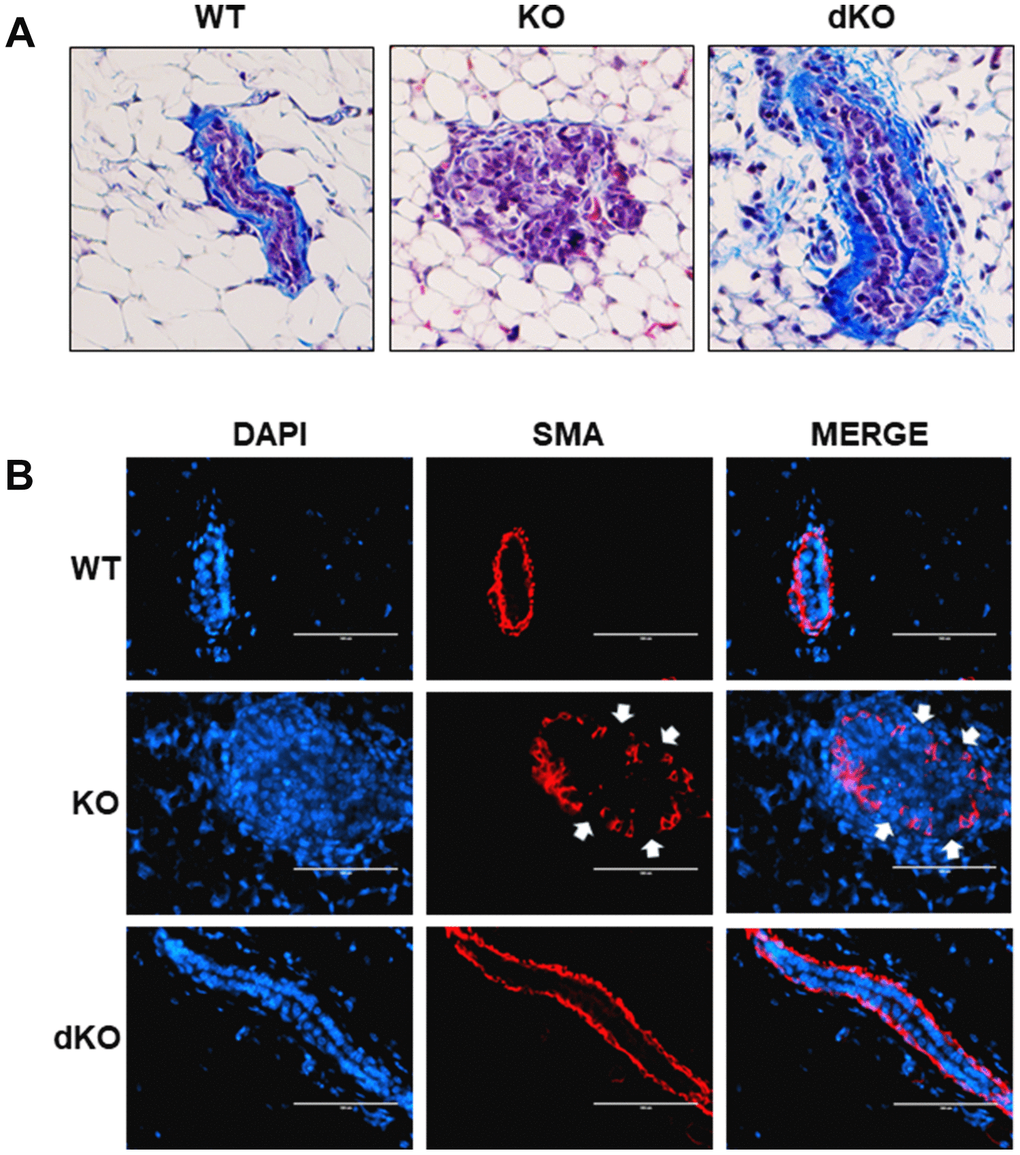 Given the reported involvement of STAT5a in driving the progression of solid tumors [16–18, 23, 24], we sought to examine closer whether a STAT5a deletion could restore mammary duct structural integrity in Cav-1 KO mice treated with estrogen. While early DCIS lesions are well-contained within the basement membrane of the mammary ducts, later stages of DCIS are characterized by a dismantled basement membrane and the presence of micro-invasion, allowing cancer cells to invade outside into the stroma, a characteristic seen in Cav-1 KO mice treated with estrogen [1, 5, 28]. To assess how STAT5a deletion affected the histological morphology of the mammary ducts in Cav-1 KO mice, we first stained WT, Cav-1 KO, and Cav-1/STAT5a dKO mammary glands with Masson's Trichrome histochemical stain, which highlights collagen layers surrounding the outside of the mammary ducts (Figure 4A). Most intriguingly, collagen deposition (integrity of the basement membrane) was maintained in Cav-1 KO mammary glands lacking STAT5a expression (Figure 4A: right panel), similar to that observed in WT mice following estrogen treatment (Figure 4A: left panel). This is a significant change compared to the degradation of collagen seen around the DCIS lesions of estrogen-treated Cav-1 KO mammary glands (Figure 4A: middle panel). Closely associated with the inner side of the basement membrane is the smooth muscle layer that allows mammary ducts to contract during lactation (myoepithelial layer). This extra layer serves as a barrier that encloses the epithelial cells, preventing their invasion into the stroma [30]. To observe the integrity of the smooth muscle layer, we immunostained WT, Cav-1 KO, and Cav-1/STAT5a dKO mammary glands with an anti-alpha smooth muscle actin (SMA) antibody to visualize the distribution of myoepithelial cells lining the inside of the basement membrane of the mammary ducts (Figure 4B). Consistent with trichrome staining, Cav-1 KO mammary glands lacking STAT5a expression maintained a continuous smooth muscle layer (Figure 4B: bottom panels) similar to WT mammary ducts (Figure 4B: upper panels), compared to Cav-1 KO proliferative lesions which exhibited apparent breaks in the myoepithelial layers (Figure 4B: middle panels). These data suggest a possible role of STAT5a in promoting invasion of Cav-1 KO DCIS lesions.