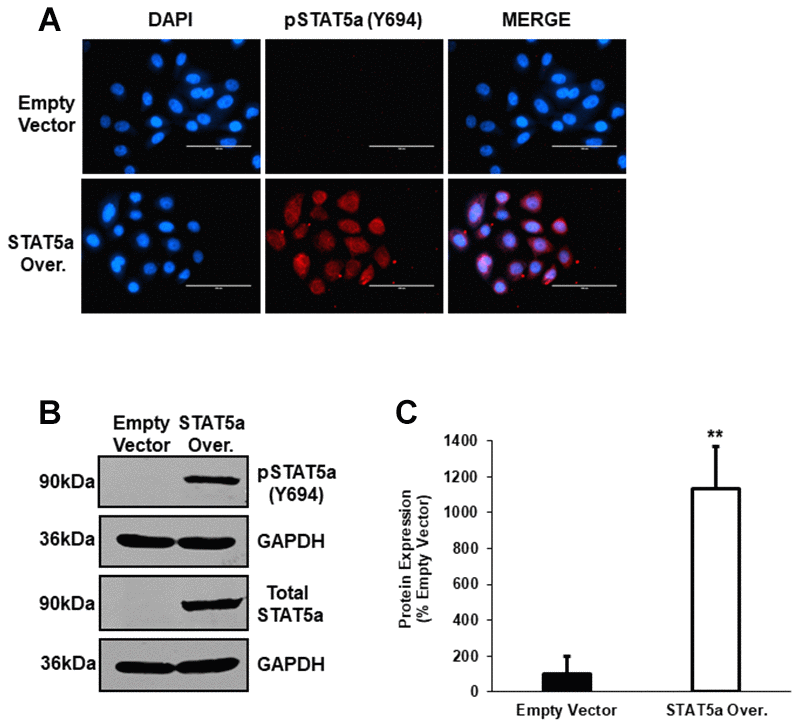 An anti-rabbit monoclonal antibody (mAb) against phosphorylated STAT5a (Y694) (Cat#9314S) was purchased from Cell Signaling Technology (Danvers, MA). An anti-mouse mAb against alpha smooth muscle actin (Cat#ab7817) were purchased from Abcam (Cambridge, MA). Anti-mouse mAbs against PCNA (Cat#sc-56) and MMP-9 (Cat#sc-393859) were purchased from Santa Cruz Biotechnology (Santa Cruz, CA). An anti-mouse mAb against glyceradehyde-3-phosphate dehydrogenase (GAPDH) (Cat#10R-2932) was purchased from Fitzgerald Industries International (Acton, MA).