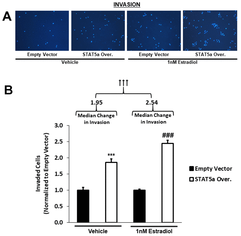 Qualitative images of invaded cells upon vehicle or estradiol treatment of empty vector vs. STAT5a overexpressor MCF10DCIS.com cells are depicted in Figure 6A. While both vehicle and estrogen-stimulated STAT5a overexpressor cells showed a significant increase in invasion compared to empty vector counterparts (1.9-fold, p<0.001. n=3, vehicle STAT5a overexpressor vs. empty vector) and (2.4-fold, p<0.001, n=3, estrogen STAT5a overexpressor vs. empty vector) (Figure 6B), invasion was significantly higher in the latter (estrogen treated group) (Figure 6B). In fact, the median change in invasion of estrogen-treated STAT5a overexpressor cells relative to estrogen-treated empty vector cells (median of 2.54, IQR of 0.39, n=3) was significantly greater compared to the median change in invasion of vehicle-treated STAT5a overexpressor cells relative to vehicle-treated empty vector cells (median of 1.95, IQR of 0.49, n=3) (p<0.001, n=3) (Figure 6B). These data demonstrate that STAT5a overexpression accelerated the invasion of MCF10DCIS.com cells in an estrogen dependent manner.