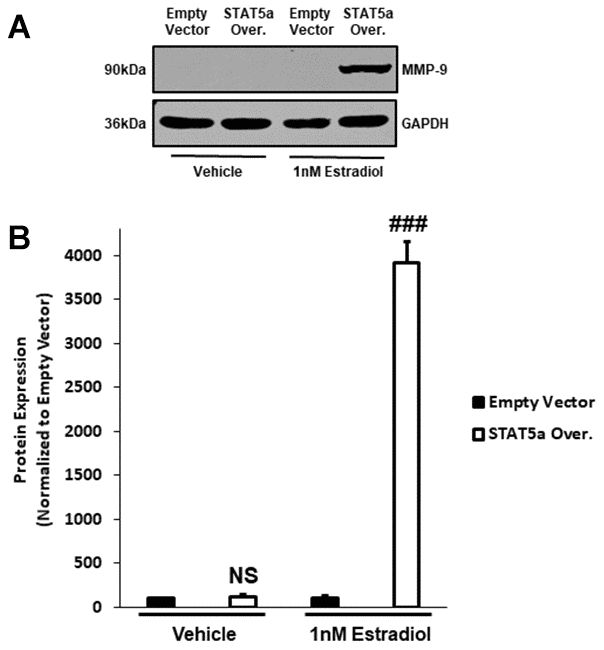 To further investigate the mechanisms associated with invasiveness of MCF10DCIS.com STAT5a overexpressor cells in response to estrogen, we sought to examine the protein expression of downstream pro-matrix metalloproteinase-9 (MMP-9). Pro-MMP-9 is a precursor that leads to the production of a basement membrane and extracellular matrix endopeptidase degrading enzyme to promote the invasion of cancer cells into the surrounding stroma, and is often used as an index of transcriptional regulation of this gene [32, 33]. Upon treating MCF10DCIS.com empty vector and STAT5a overexpressor cells with vehicle or estrogen, protein expression of pro-MMP-9 was determined by western blot (Figure 7A). Quantitatively, densitometry revealed that while pro-MMP-9 expression did not differ between vehicle-treated empty vector and vehicle-treated STAT5a overexpressor cells (NS, p=0.382, n=3) (Figure 7B), STAT5a overexpressor cells demonstrated a significant increase in protein expression of pro-MMP-9 compared to empty vector counterparts upon estrogen treatment (39.1-fold, p<0.001, n=3) (Figure 7B).