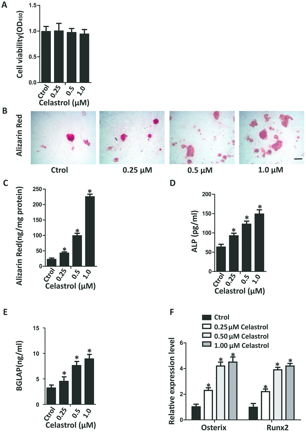 In recent years, research on Celastrol has become increasingly popular due to the therapeutic effects of this active ingredient. In order to investigate the impacts of various dosages of Celastrol on the osteogenic differentiation of BM-MSCs, first a Cell Counting Kit-8 (CCK-8) assay was performed to evaluate the cytotoxicity of Celastrol. The result of CCK-8 assay recommended that Celastrol did not influence cell viability at concentrations of 0.25, 0.5 and 1.0 μM (Figure 1A, P=0.8264). Next, the BM-MSCs were cultured in an osteogenesis induction medium with different concentrations of Celastrol. The osteogenic differentiation capacity of BM-MSCs increased in a dosage-dependent manner, as demonstrated using Alizarin Red staining (Figure 1B, 1C, P<0.0001 (Figure 1C)). Moreover, osteoblast differentiation markers, alkaline phosphatase (ALP) activity and bone gamma-carboxyglutamic acid-containing protein (BGLAP) secretion also increased, compared with that of control cells (Figure 1D, 1E; P<0.000 1 (Figure 1D), P<0.0001 (Figure 1E)). Moreover, mRNA levels of the osteoblast transcription factors, Osterix and Runx2, were rapidly elevated due to Celastrol treatment in a dosage-dependent manner (Figure 1F, P<0.0001). Together, these results recommended that Celastrol induced the osteogenic differentiation of BM-MSCs in vitro.