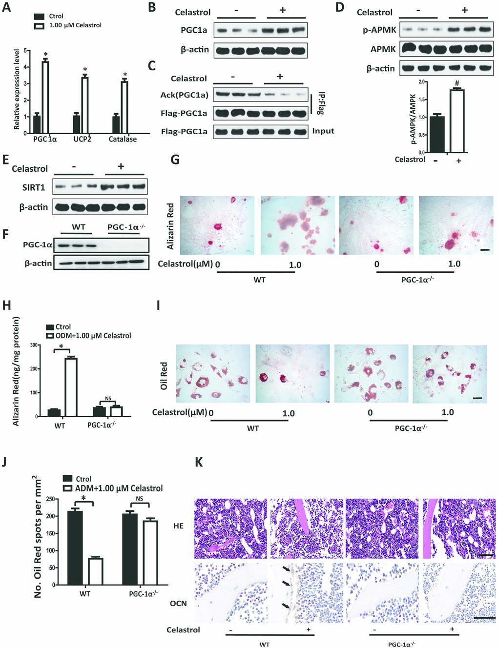 In order to further confirm the role of PGC-1a in vivo, PGC-1α-knockout (PGC-1α-/-) mice (2 month old) and WT mice (2 month old) were ovariectomized. 12 weeks later, the mice were intraperitoneally injected with Celastrol (200 μg/kg) or DMSO (control), every two days for 4 weeks. As expected, Celastrol treatment reduced the number and area of adipocytes in the bone marrow and increased the number and surface of osteoblasts on trabecular and endosteal bone surfaces in WT OVX mice, while the curative effect of Celastrol in PGC-1α-/- OVX mice was offset (Figure 3K). Taken together, these results indicated that Celastrol regulated the differentiation of BM-MSCs by activating PGC-1α signaling.
