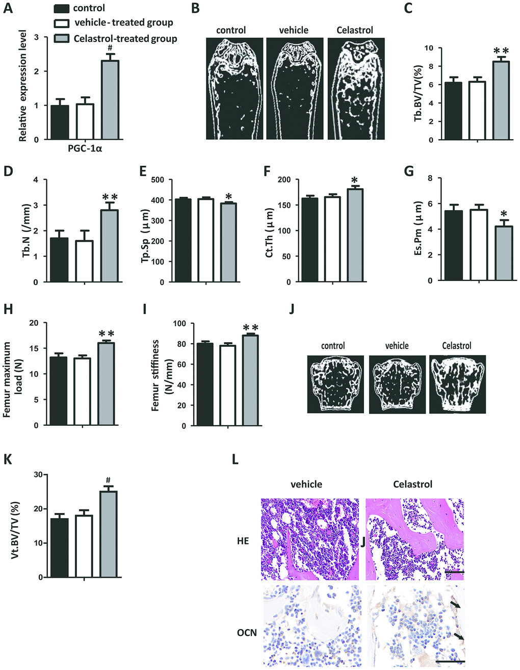 In order to explore the remedial potential of Celastrol on aging-associated osteoporosis, aged (18 month old) male mice were intraperitoneally injected with Celastrol (200 μg/kg, 98% (HPLC), Sigma, St. Louis, MO) or DMSO (control) every two days for 4 weeks. Mice treated with Celastrol showed increased PGC-1α expression levels, compared with the vehicle-treated group (Figure 4A, P=0.0003). As a result, Celastrol augmented trabecular bone volume and number, as well as cortical bone thickness, and reduced trabecular separation and the endosteal perimeter (Figure 4B–4G; P=0.0031 (Figure 4C), P=0.0084 (Figure 4D), P=0.0187 (Figure 4E), P=0.0263 (Figure 4F), P=0.0259 (Figure 4G)). Moreover, the bone strength of Celastrol treated mice was higher (Figure 4H–4I; P=0.0021 (Figure 4H), P=0.0031 (Figure 4I)). Vertebral bone volume was also higher in Celastrol treated mice, compared with the vehicle-treated group (Figure 4J–4K; P<0.0001 (Figure 4K)). In addition, Celastrol–treated mice showed an obviously lower number and area of adipocytes in bone marrow and a higher number and surface area of osteoblasts on the trabecular and endosteal bone surfaces (Figure 4L). Thus, together these results indicated that the administration of Celastrol alleviated bone loss and MAT accumulation in aged mice.