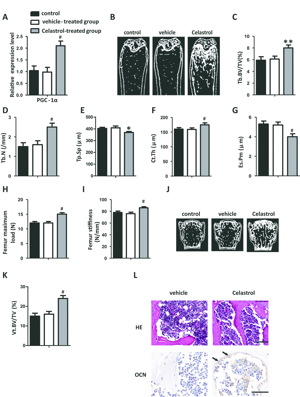 These outcomes indicated that Celastrol could regulate bone marrow stem cell differentiation and bone-fat balance in OP and skeletal aging by stimulating PGC-1α, which might act as a possible therapeutic target for OP and for the prevention of skeletal aging.
