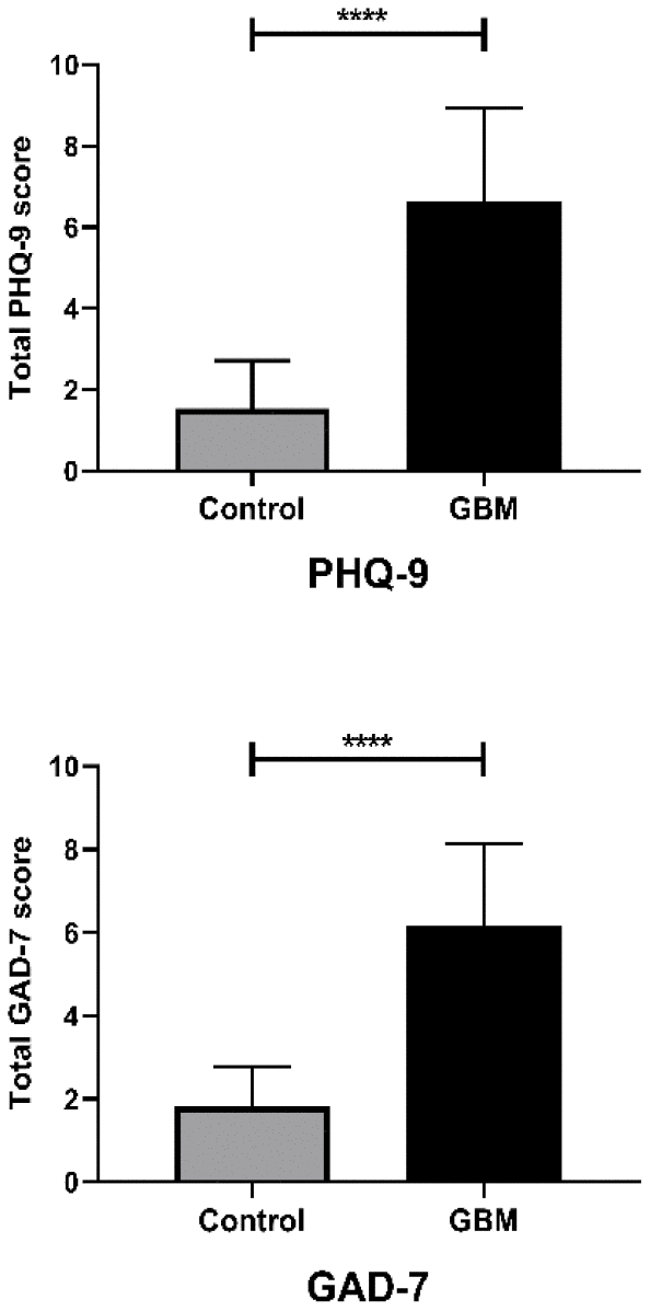 Figure 1. Questionnaire results differed between GBM patients and controls, and between genders. Bar plot comparing the PHQ-9 and GAD-7 questionnaire results between the control and GBM groups; ****, P < 0.0001. Student’s t-test was used for statistical analysis.