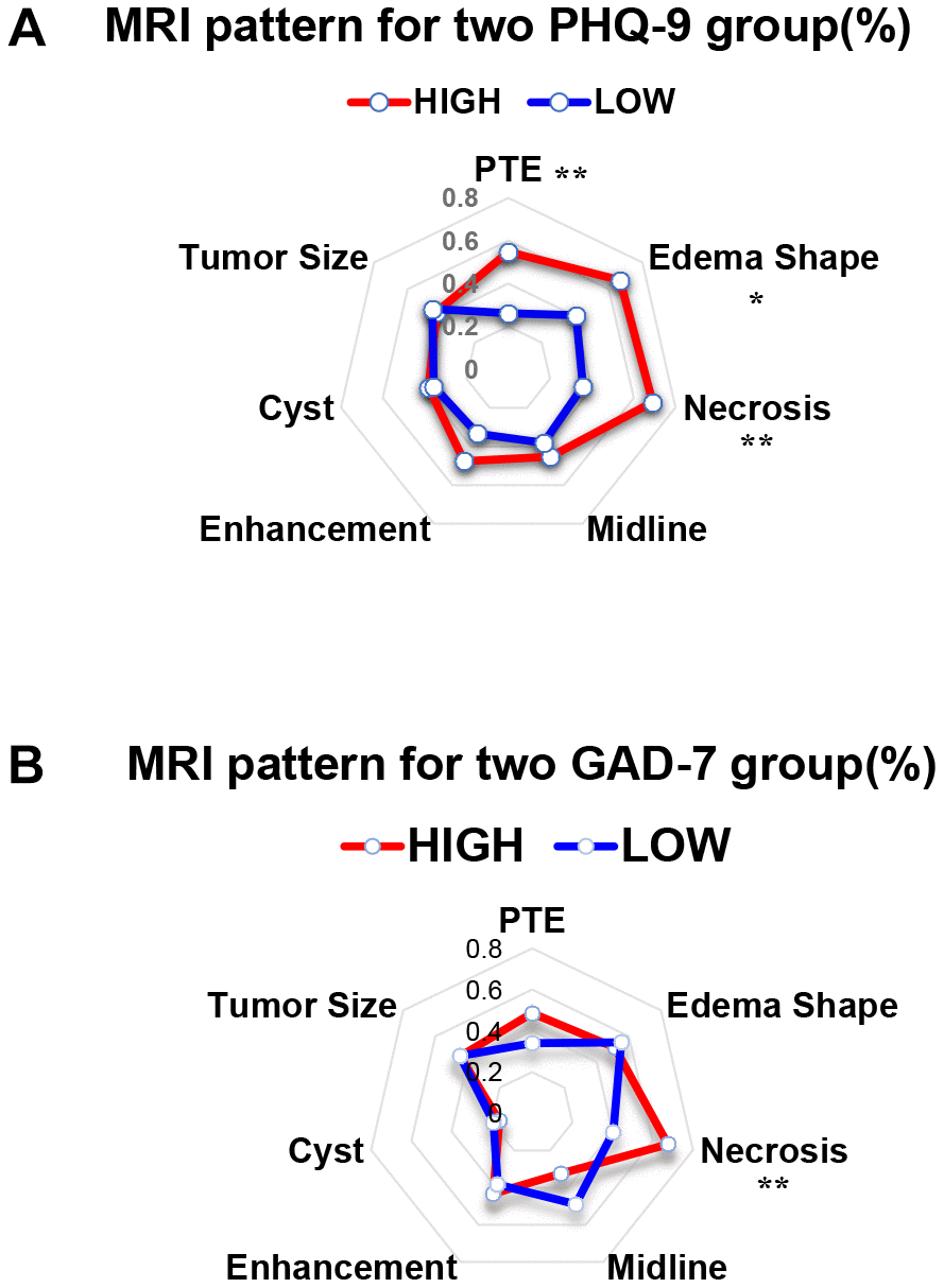Figure 3. The MRI results of patients with different PHQ-9 and GAD-7 scores presented different features. (A) Radar chart showing the MRI features of the high and low PHQ-9 groups. Chi-squared analysis was conducted as the statistical method. **, P < 0.01; *, P < 0.05. (B) Radar chart showing the MRI features of the high and low GAD-7 groups. Chi-squared analysis was conducted as the statistical method. **, P < 0.01.