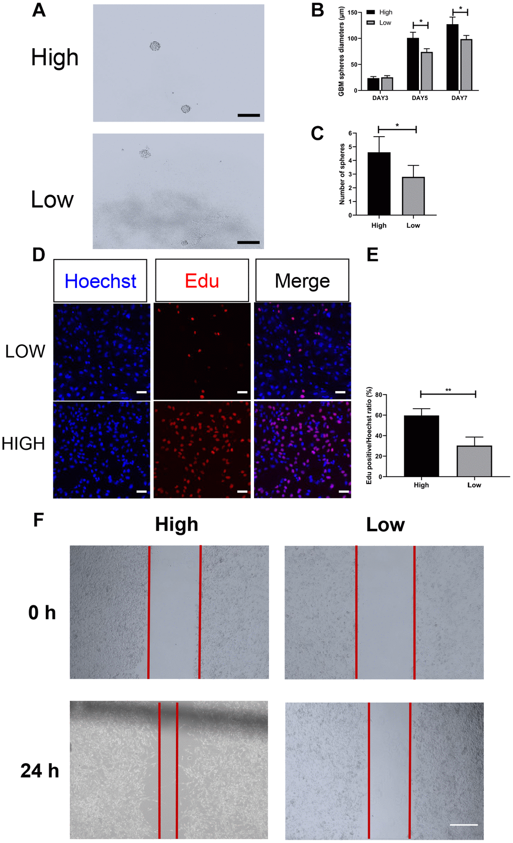 Figure 4. Cellular experiments revealed differing proliferation and invasion abilities in the high- and low-score groups. (A–C) Morphology of GBM spheres in the high and low PHQ-9/GAD-7 groups. The diameters of the GBM spheres in both groups increased gradually on days 3, 5 and 7, but those in the high group grew significantly faster (high group, n = 3; low group, n = 3). The number of spheres that developed from single cells was significantly greater in the high group than in the low group (P = 0.0216, n = 5). Data are presented as the mean ± standard error, and Student's t-test was chosen as the statistical method; *, P < 0.05. Scale bar: 200 μm. (D, E) The proliferation capacities of primary GBM cells from the different groups were evaluated with an EdU assay. Primary GBM cells from the low group (top) and high group (bottom) were stained with EdU (red, middle) and counterstained with Hoechst (blue, left). The ratio of EdU-positive cells to the total number of Hoechst-labeled cells is presented as the mean ± standard error, and Student's t-test was chosen as the statistical method; ***, P < 0.001, n = 3. Scale bar: 20 μm. (F) Wound healing assay of primary GBM cells from the high and low PHQ-9/GAD-7 groups. A six-well plate was scratched, and primary cells from the different groups were photographed at 0 and 24 h.