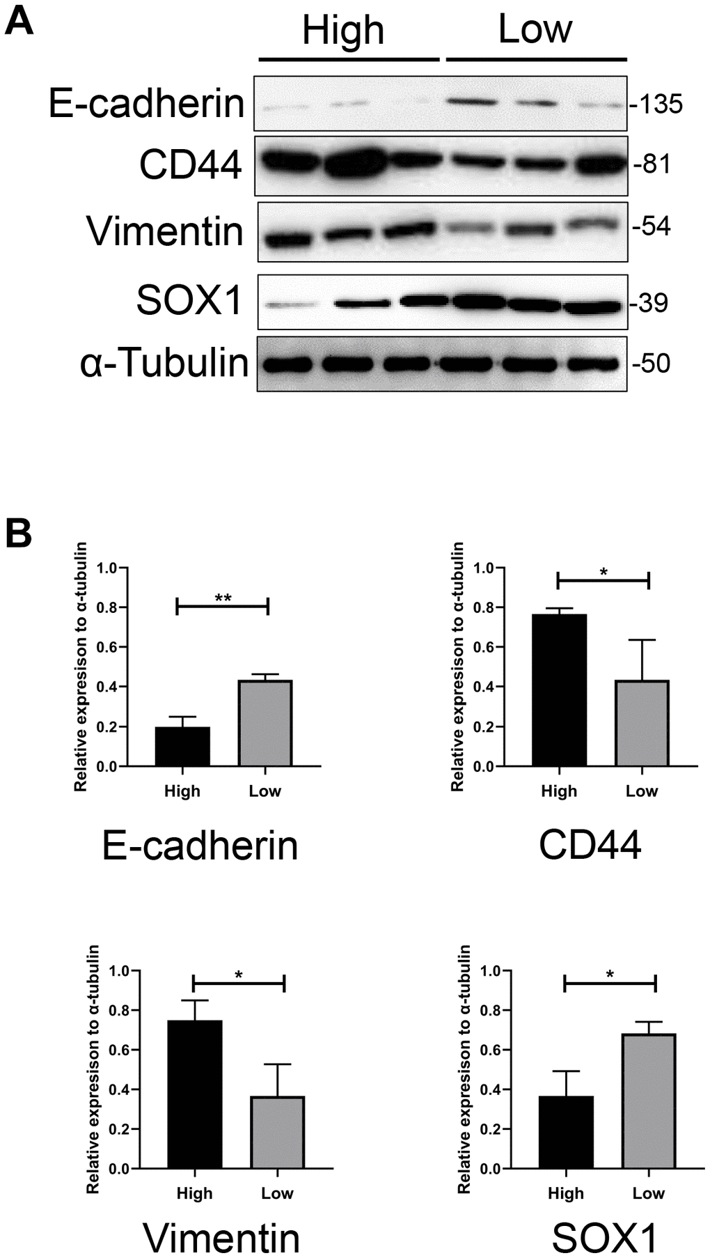 Figure 5. The expression pattern of mesenchymal and epithelial markers in both groups. (A) Western blotting assay showed significantly higher expression of CD44 and Vimentin, and lower expression of Sox1 and E-cadherin in GBM cells from higher scored group than lower scored group. α-tubulin was used as internal reference. (B) Bar charts showed the relative expression of these markers to α-tubulin and revealed the statistically different expression of these markers between two groups.