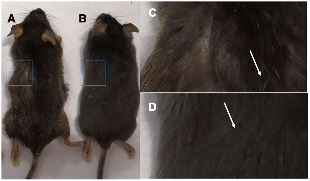 Gross view with the naked eye: white hair appeared in C57 mice at 18 months of age (Figure 1C), and the hair of 2-month-old mice was smooth and without white hair (Figure 1D).