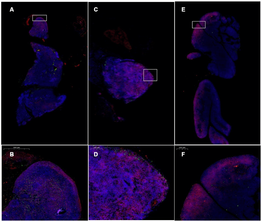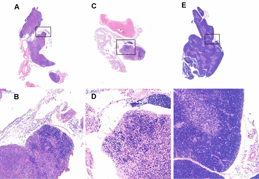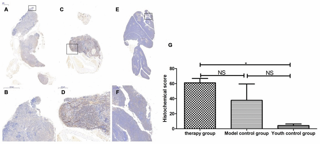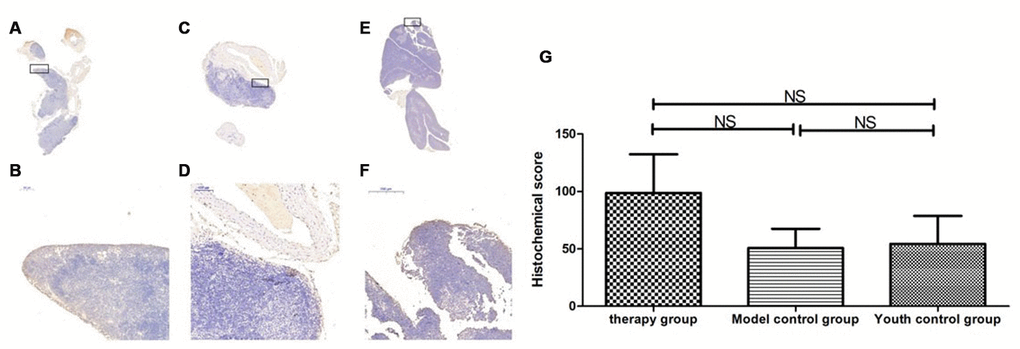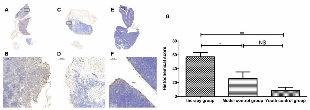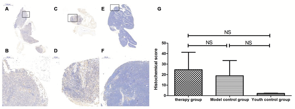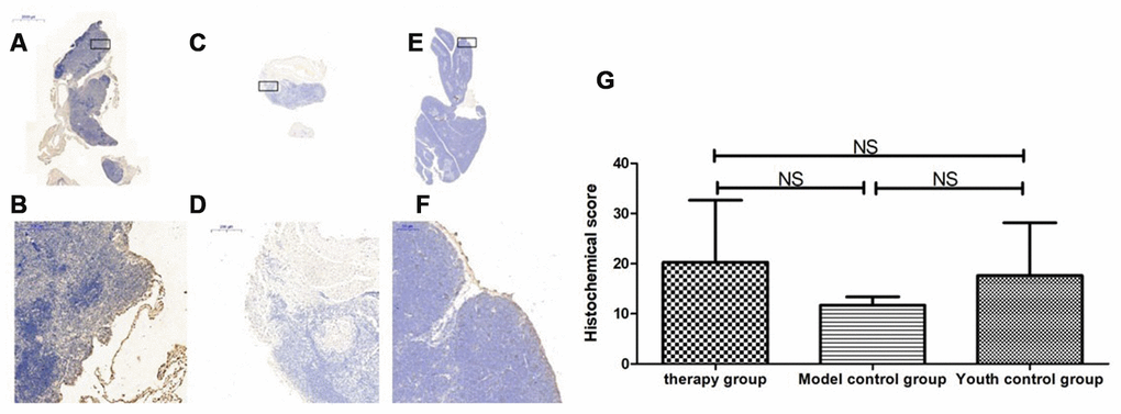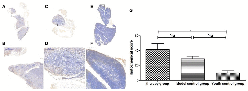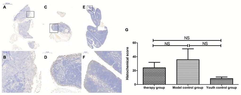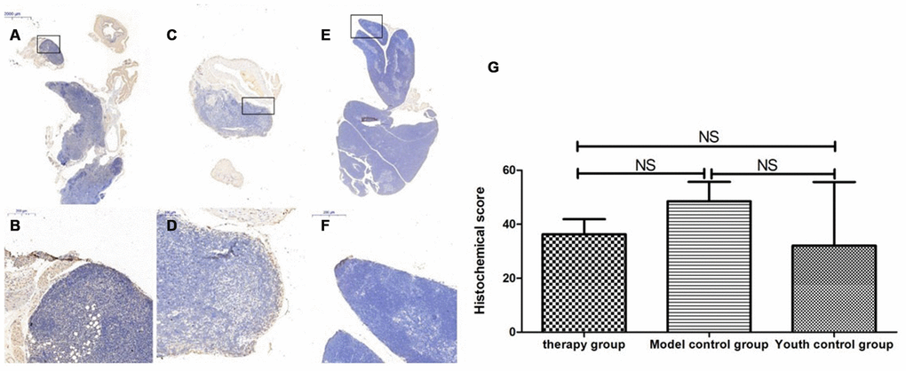 After HE staining, an inverted microscope was used to make observations. (1) The thin layer of connective tissue was visible on the surface of the thymus tissue of the young control group. The thymocyte leaflet interval was not obvious, the cortex and medulla were clearly defined, and the thymus cells in the cortex were dense, so the coloration was deep. The medulla contained more TECs, so the coloration was lighter, and the appearance of the thymus was consistent with that observed in young mice (Figure 9A, 9B). (2) The thymus tissue in the treatment group was reduced in size and did not have the shape of small leaves; the cortical portion was greatly reduced, and the boundary of the cortex and medulla was not clear. Part of the medulla appeared to be apoptotic and necrotic, and the nuclei were deeply stained; the cytoplasmic eosinophils were enhanced (Figure 9C, 9D). (3) The thymus tissue of the model control group was reduced in size and unclear. Only a few diffusely distributed lymphoid cells and a small amount of connective tissue were observed (Figure 9E, 9F).