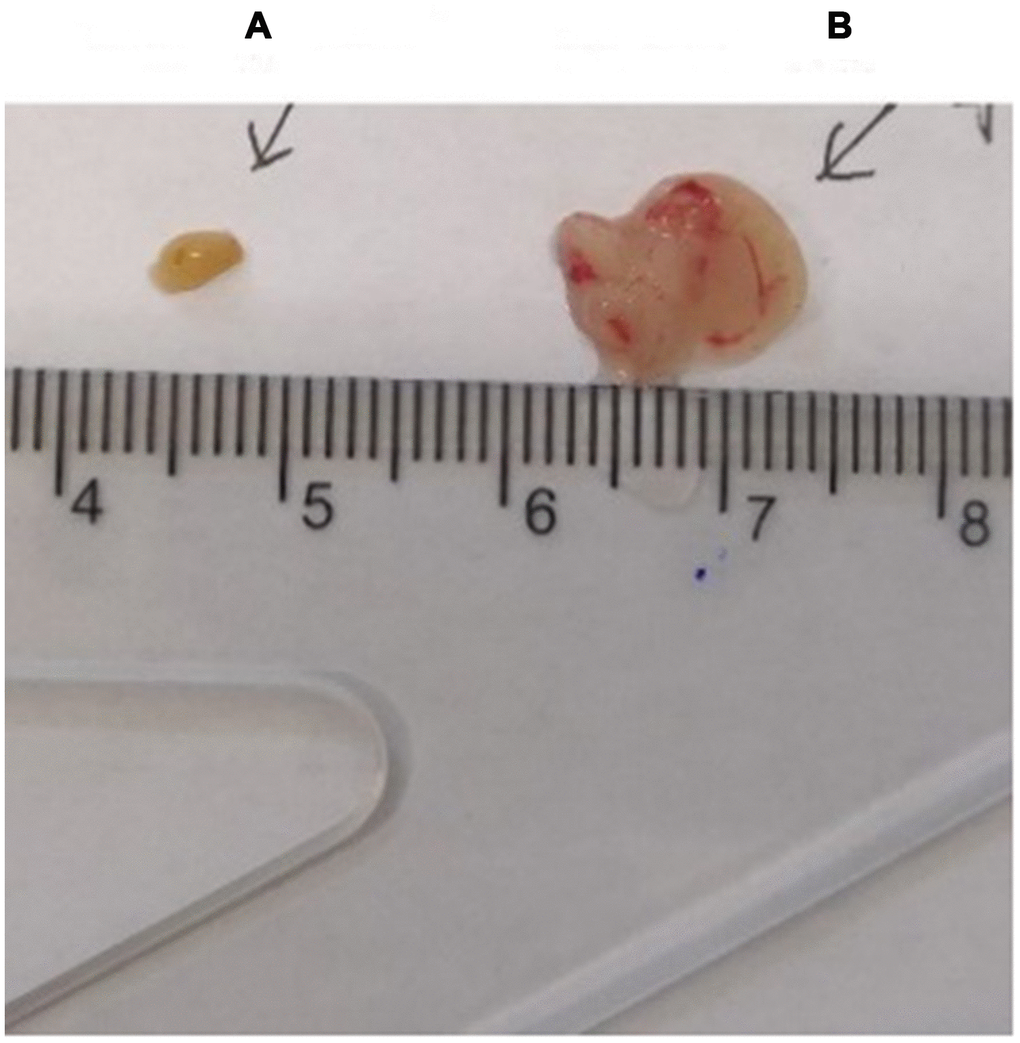 The thymus weight, body weight, and thymus/body weight ratio of C57 mice are shown in Table 1; the mouse thymus size was observed visually (Figure 2).