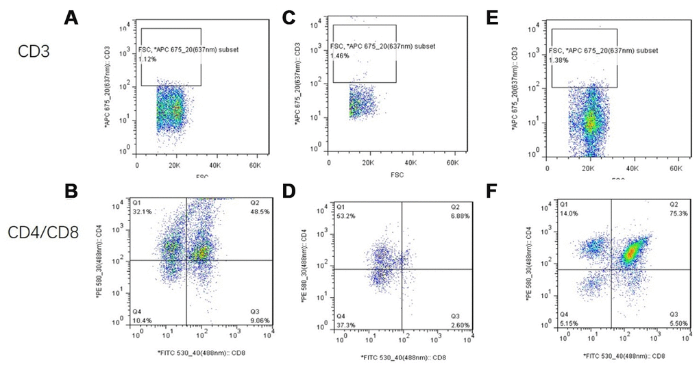 The thymus tissue was cut into small 1 mm3 tissue pieces with scissors and digested with 0.1% type II collagenase at 37 °C for 30 mins. The cells were filtered through a 70-mesh filter, and the cells were observed to show a single state under a microscope. The cells were centrifuged at 400×g for 5 mins and then resuspended in 1× PBS to a concentration of 1×107 cells/mL, after which 100 μL of cell suspension was added per tube with 5 μL each of anti-mouse PE-CD4, FITC-CD8, APC-CD3, PE-CF594-FOXP3, and Percp-cyTm5.5-CD25 antibodies; equal amounts of PE-IgG, FITC-IgG, APC-IgG, PE-CF594-IgG, and Percp-cyTm5.5-IgG were added to the isotype control tube. The cells were incubated at room temperature for 30 mins in the dark, and then 300 μL of PBS was added, after which the cells were filtered with a 400-mesh filter before detection. Detection was performed using a BD FACSAria III flow cytometer and analyzed using FlowJo 7.6 software. Changes in mouse thymus lymphocyte subsets were observed.