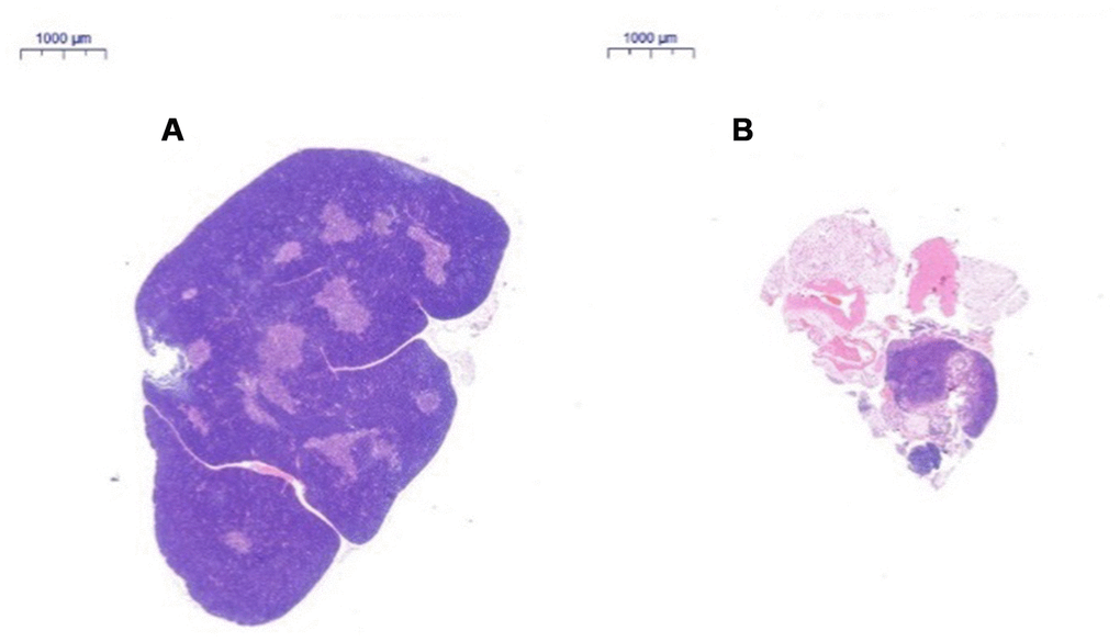 After HE staining, the tissue was observed by inverted microscopy. (1) HE staining of the thymus in 2-month-old C57 mice: A thin connective tissue envelope was observed on the surface of the thymus tissue, the thymocyte leaflet interval was not obvious, and the cortex and medulla were clearly defined. The thymus cells in the cortex were dense, and its coloration was deeper. The medulla contained more TECs and had lighter coloration. A large thymus were observed in young mice (Figure 3A). (2) HE staining of the thymus in 18-month-old C57 mice: The volume of the thymus was reduced, and the boundary of the cortex and medulla was not clear; most of the thymus tissue had been replaced by adipose tissue, and only a small portion of the cortex and medulla remained. A small number of lymphoid cells were scattered in the adipose tissue, which is a typical characteristic of old age (Figure 3B).