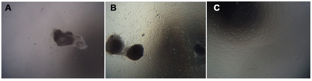 The umbilical cord tissue pieces were inoculated in a 10 cm culture dish based on the characteristics of adherent mUCMSC growth. After 1 day, the cells were observed climbing out of the dish (Figure 4A). After 6 days, the cells isolated from the umbilical cord tissue expanded and spread within the surrounding space, and the confluence of the long spindle cells reached 80% (Figure 4B). Passaging was carried out, and the first purification sort was performed. After the P3 generation, the cells were homogeneous, long, fusiform and fibroblast-like (Figure 4C).