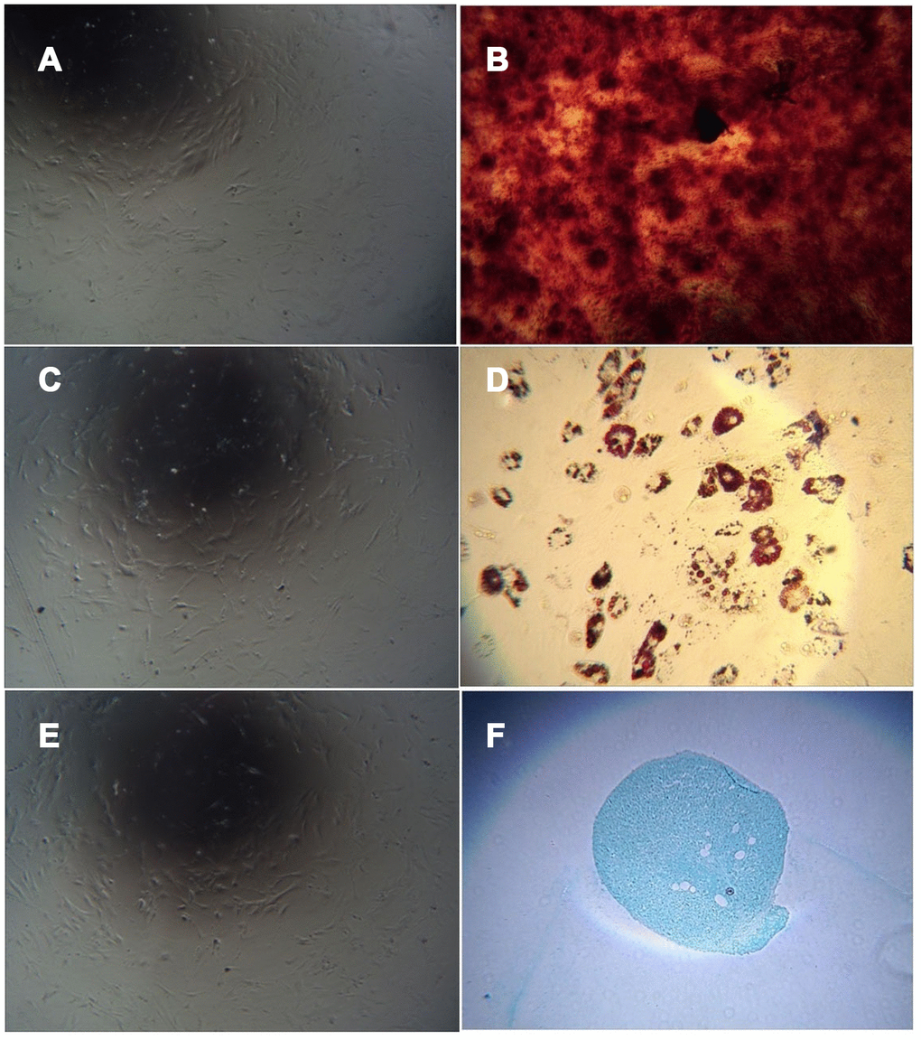 The cells obtained by adherent culture of umbilical cord tissue were long, spindle-shaped and fibroblast-like (Figure 5A). After culturing in osteogenic induction medium and staining with alizarin red, red-stained calcium nodules were observed (Figure 5B). After culture in adipogenic induction medium, the cells became round, and small lipid droplets appeared in the cells, which were stained with oil red O. Red-stained lipid droplets were visible (Figure 5D). After culture in chondrogenic induction medium, staining with alcian blue caused the cartilage tissue to appear blue (Figure 5F). Uninduced cells were not stained (Figure 5A, 5C, 5E).