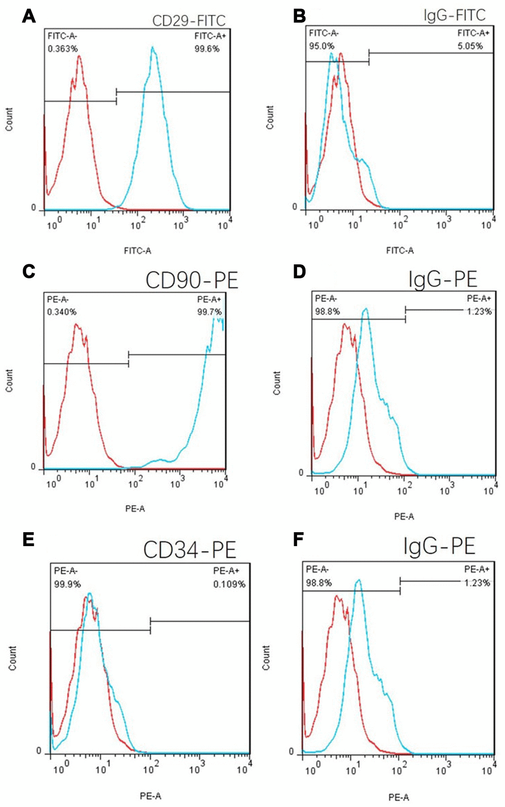 CD29, CD90 and CD34 antibodies were used to label C57 mouse umbilical cord tissue adherent culture cells. The positive proportion of CD29 cells was 99.6% (Figure 6A), and the CD90 positive proportion was 99.7% according to flow cytometry (Figure 6C). The positive proportion of CD34 cells was 0.109% (Figure 6E), which was in line with the phenotypic characteristics of mouse MSCs. Isotype controls are Figure 6B, 6D and 6E.